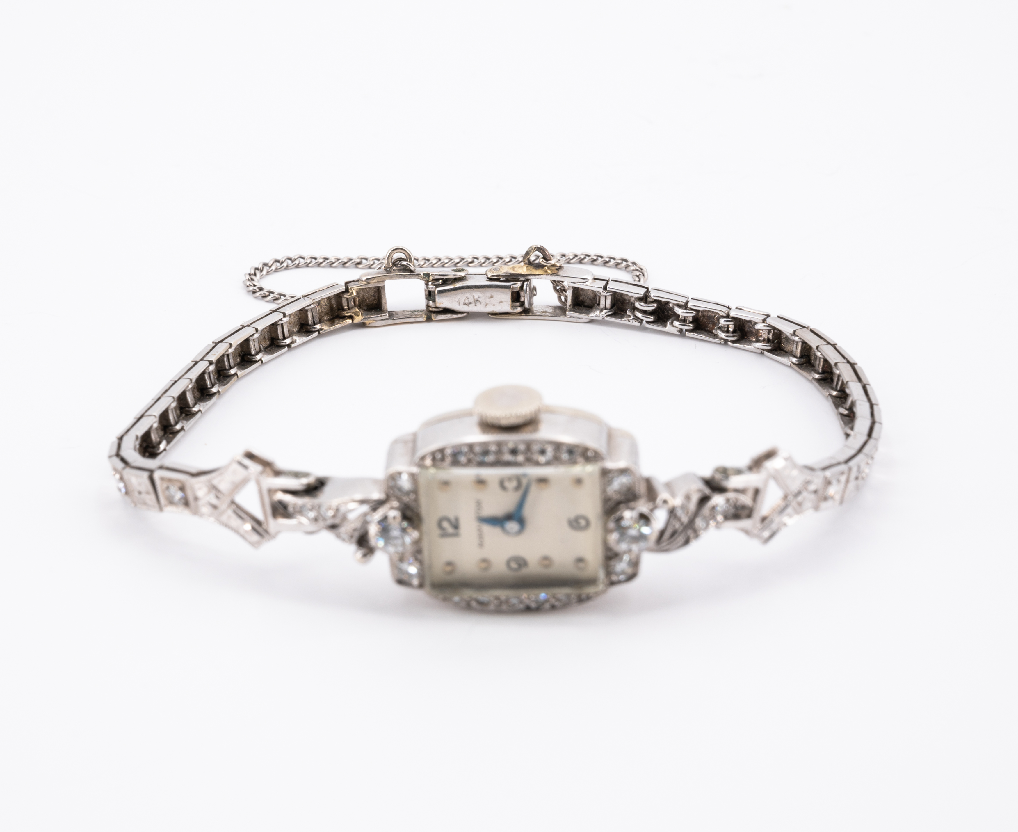 Gehäuse/Armband: 585/- Weißgold, Lünette Diamantgeziert, Zffbl. weiß lackiert, röm. Indizes schwarz lackiert, Punktindizes silbern, Zeiger gebläut.
