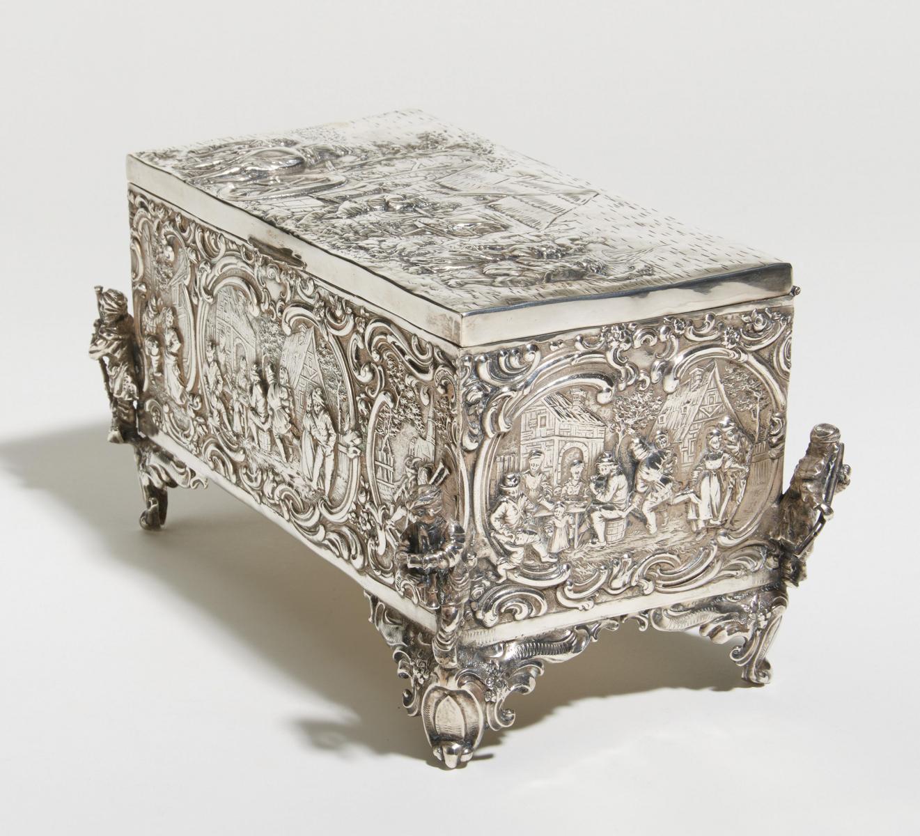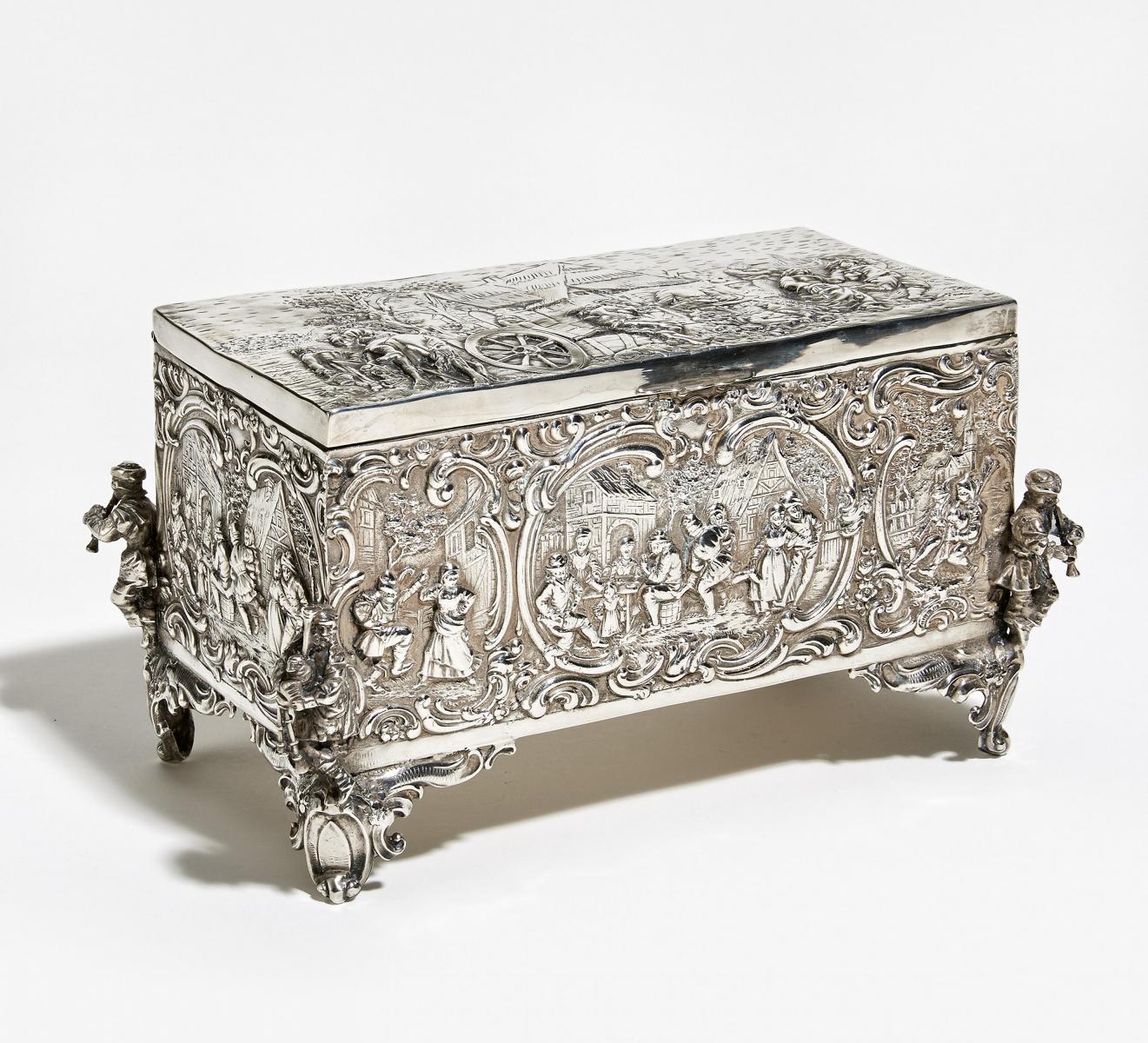 Beschreibung: Auf den Ecken vollplastische Musikantenfiguren. Wandung mit vielfigurigen, bäuerlichen
