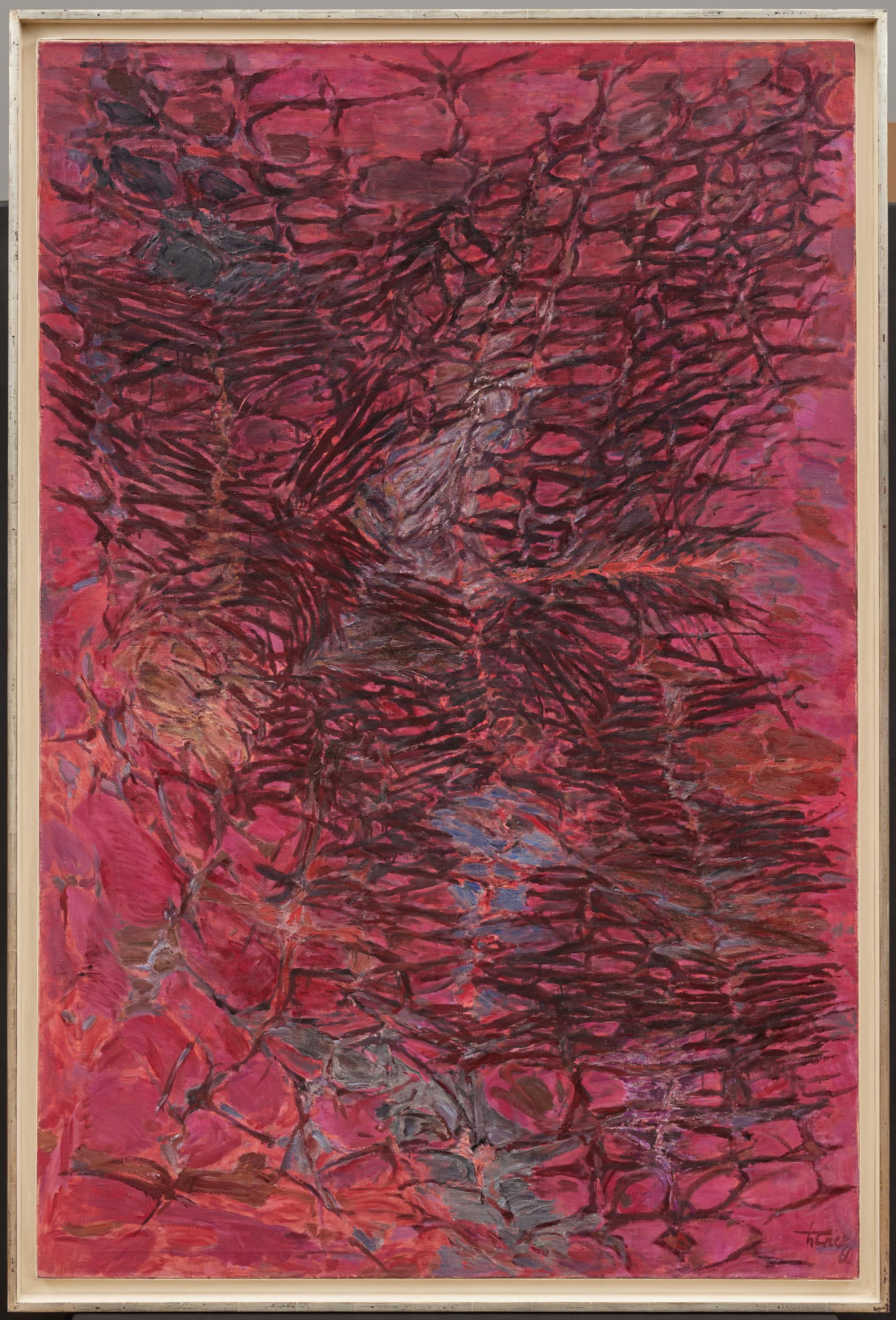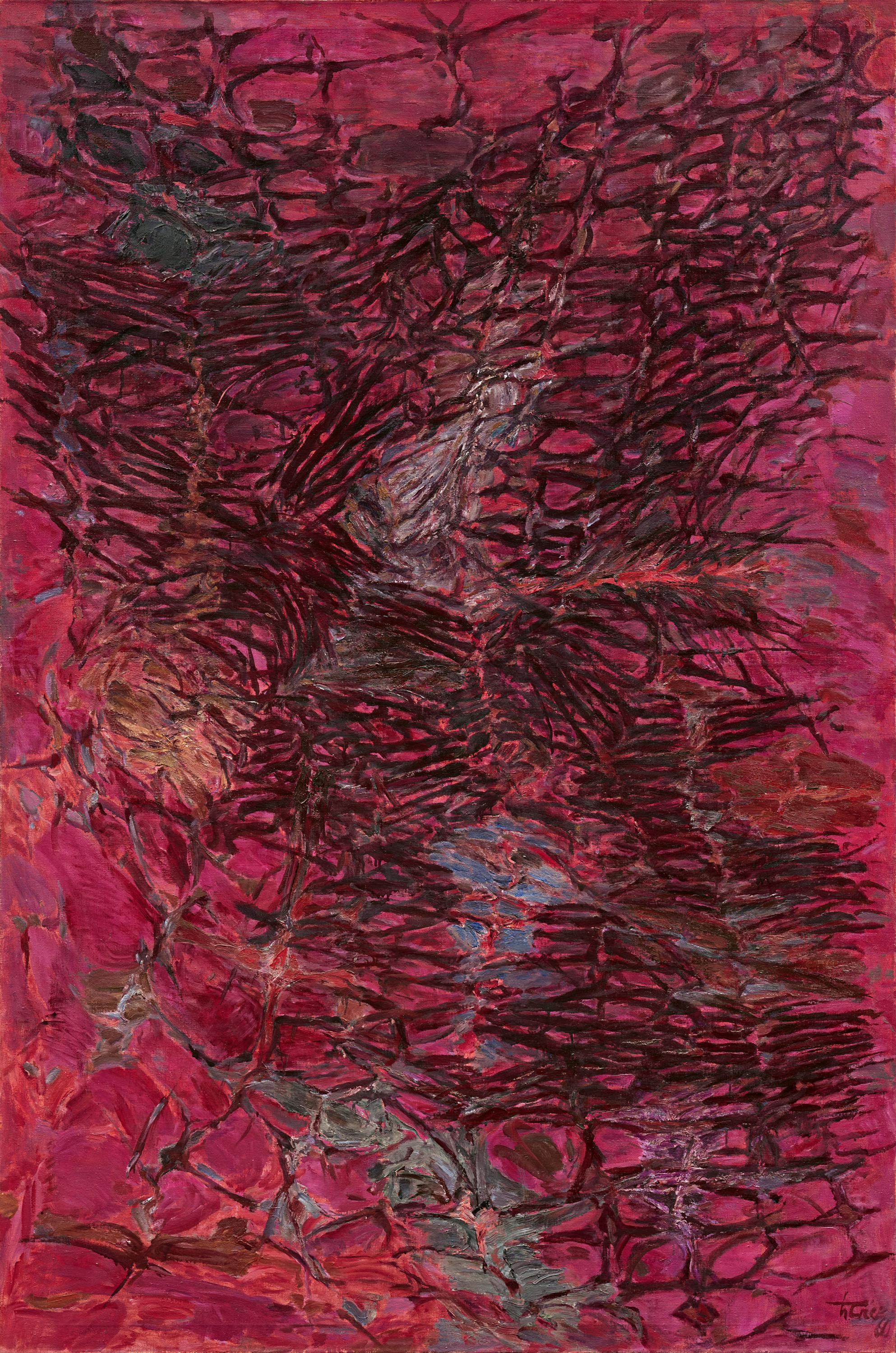 Mit Beginn der 1950er Jahre wird für Hann Trier die Linie zum zentralen Bildelement. Sie ist für ihn Energie und Bewegung. Der abbildende Charakter rückt immer mehr in den Hintergrund, während das Gemalte den Malprozess an sich reflektieren soll. Im Fokus seiner Arbeit steht die Bewegung. So beginnt Hann Trier in den 1950er Jahren auch mit zwei Pinseln gleichzeitig - in jeder Hand einen - zu malen. Als 1960 seine Arbeit "Keltern" entsteht, hat er das beidhändige Malen bereits entwickelt. Den Betrachtenden öffnet sich ein undurchdringbares Geflecht von Linien, die sich zu einer Gitterstruktur vereinen. Die schwarzen Linien auf rotem Grund wirken einerseits kontrastierend, andererseits harmonieren die Farben der Komposition auf interessante Weise miteinander. Durch die Tiefe des Schwarzes entsteht beinahe ein Eindruck von Dreidimensionalität. Je länger man das Werk betrachtet, desto mehr Ebenen der Komposition eröffnen sich den Betrachtenden. Mit der Zeit beginnt man den Rhythmus, die Bewegung, die Energie zu entdecken, von denen Hann Trier in seiner Arbeit beeinflusst ist. Schauen wir als Betrachtende genau hin, erkennen wir die unterschiedlichen Richtungen der Pinselstriche, die sich aus der beidhändigen Malweise ergeben. Die unterschiedlich eng gesetzten Linien geben hier und da den Blick auf den roten Hintergrund frei, der dadurch die Facetten seiner Intensität offenbart. Mit seinem Werk "Keltern" gelingt Hann Trier das Festhalten von Energie und Bewegung im Bild. Die Kombination aus verschlungenen Linien und kontrastierenden Farben lässt das Bild pulsieren. Betrachtet man das Bild lang genug, offenbart es, was Hann Trier meinte als er sagte, er tanze mit den Pinseln.