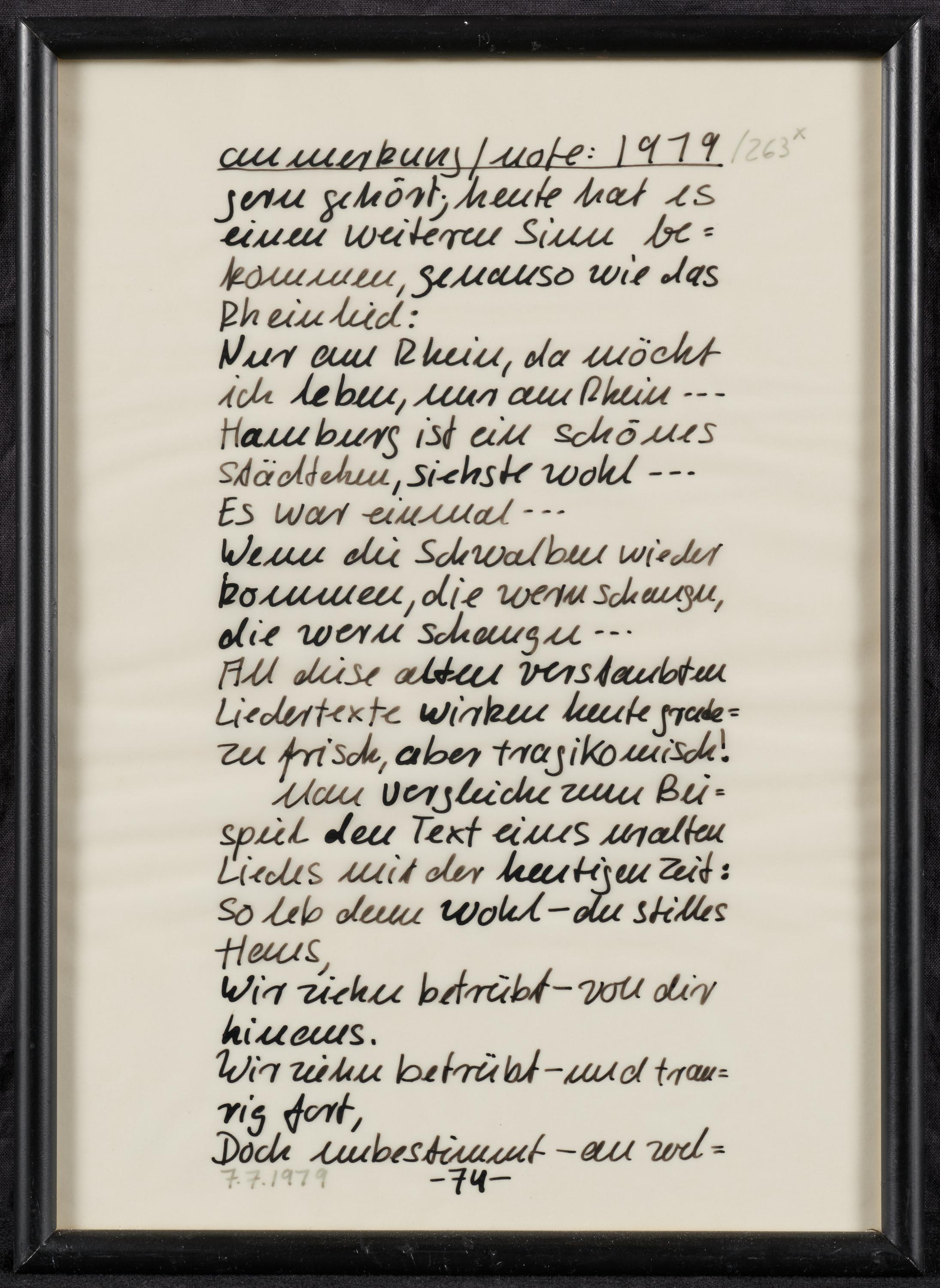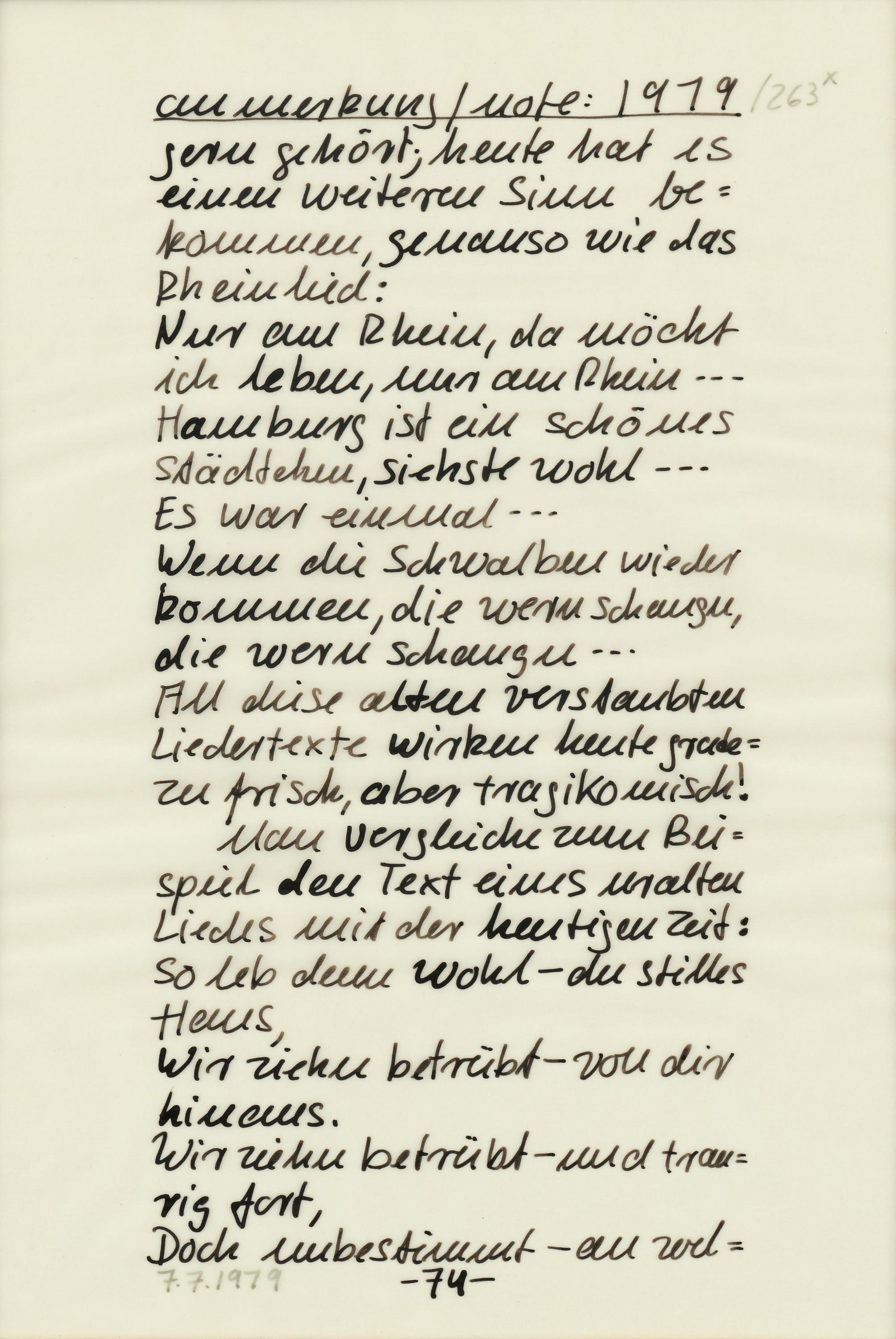 Es sind auch dieser Wechsel und die Verknüpfungen zwischen verschiedenen Ebenen, die Hanne Darboven als eine der faszinierendsten Konzeptkünstlerinnen auszeichnen. Der Hintergrund, der mit den zitierten Texten in ihren Werken verknüpft sein kann, erscheint als Gegensatz zu Darbovens konzeptuellem Schreiben, der rhythmischen Abfolge ihrer handschriftlichen Loops. Zugleich äußert sich die Künstlerin nicht zu ihren Abschriften und ihrer eigenen Verortung hierin gemäß ihrem Motto "ich schreibe, aber ich beschreibe nichts", so dass die Wiedergabe von Äußerungen Dritter auch irritierend beliebig wirken kann. (Vgl. www.hanne-darboven.org/stiftung)