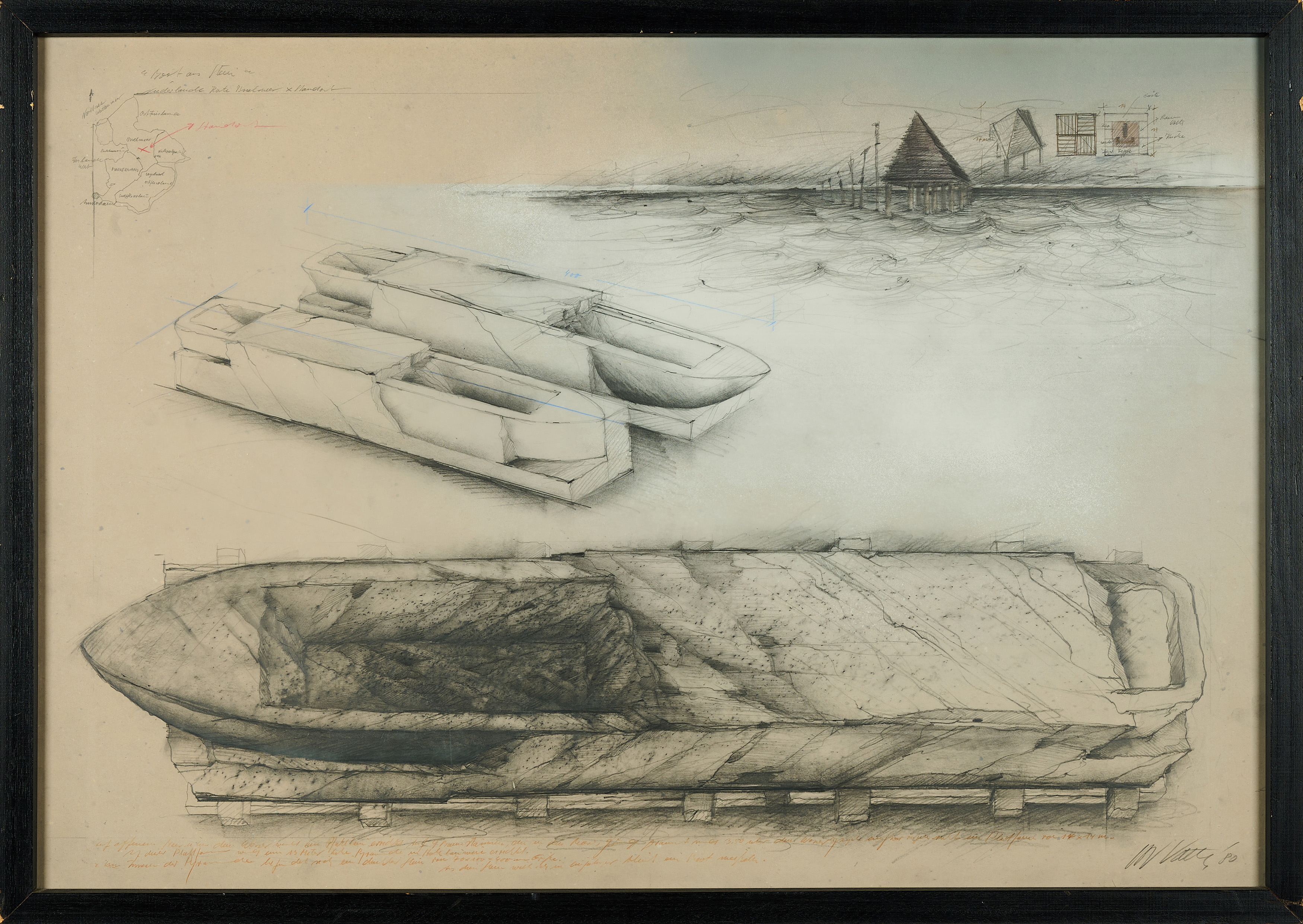 Bezeichnung: Betitelt oben links: "Boot aus Stein". Sowie signiert und datiert unten rechts: H. Voth '80.