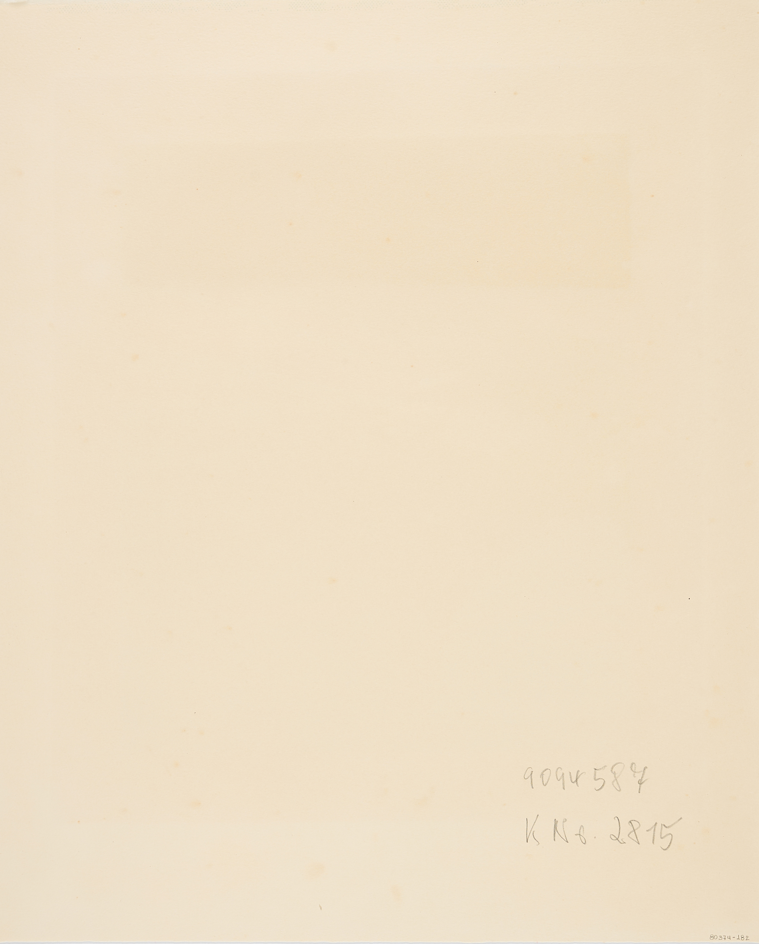 Unregelmäßig schwach gebräunt, im ehemaligen Passepartoutausschnitt stärker gebräunt. Einzelne Stockflecken und bräunliche Verfärbungen, ebenso verso. Hier zudem oberer Rand mit Leimspur. Durchfettende Druckfarbe. Bleistiftbeschriftung. Ansonsten guter Zustand.