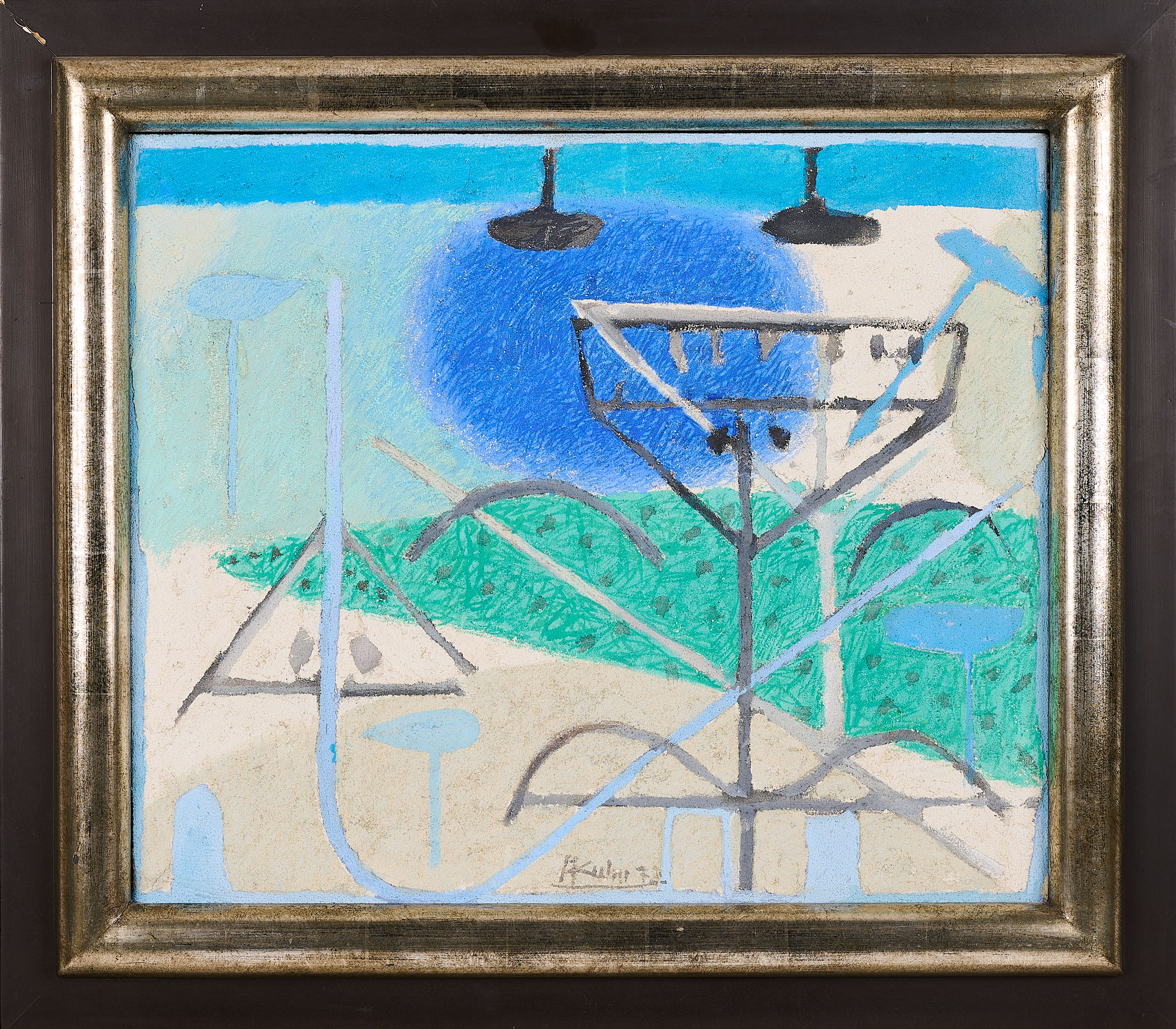 Geringe Leinwandspannung. Minimal verschmutzte Malfläche. Ansonsten sehr guter Zustand. Im Rahmen beschrieben.