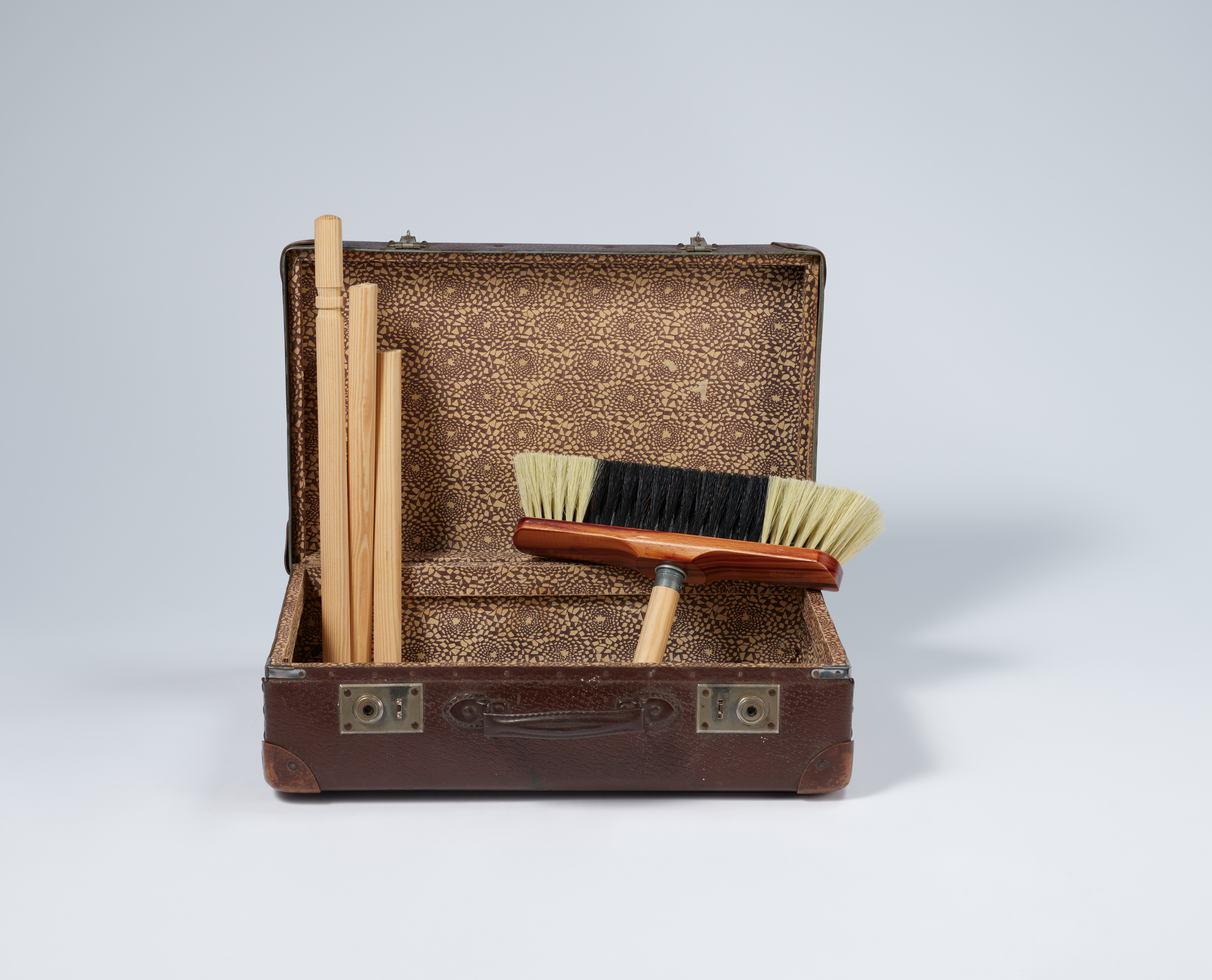 Technik: Koffer, Besen und Besenstiel, in 4 Einzelteile zersägt.