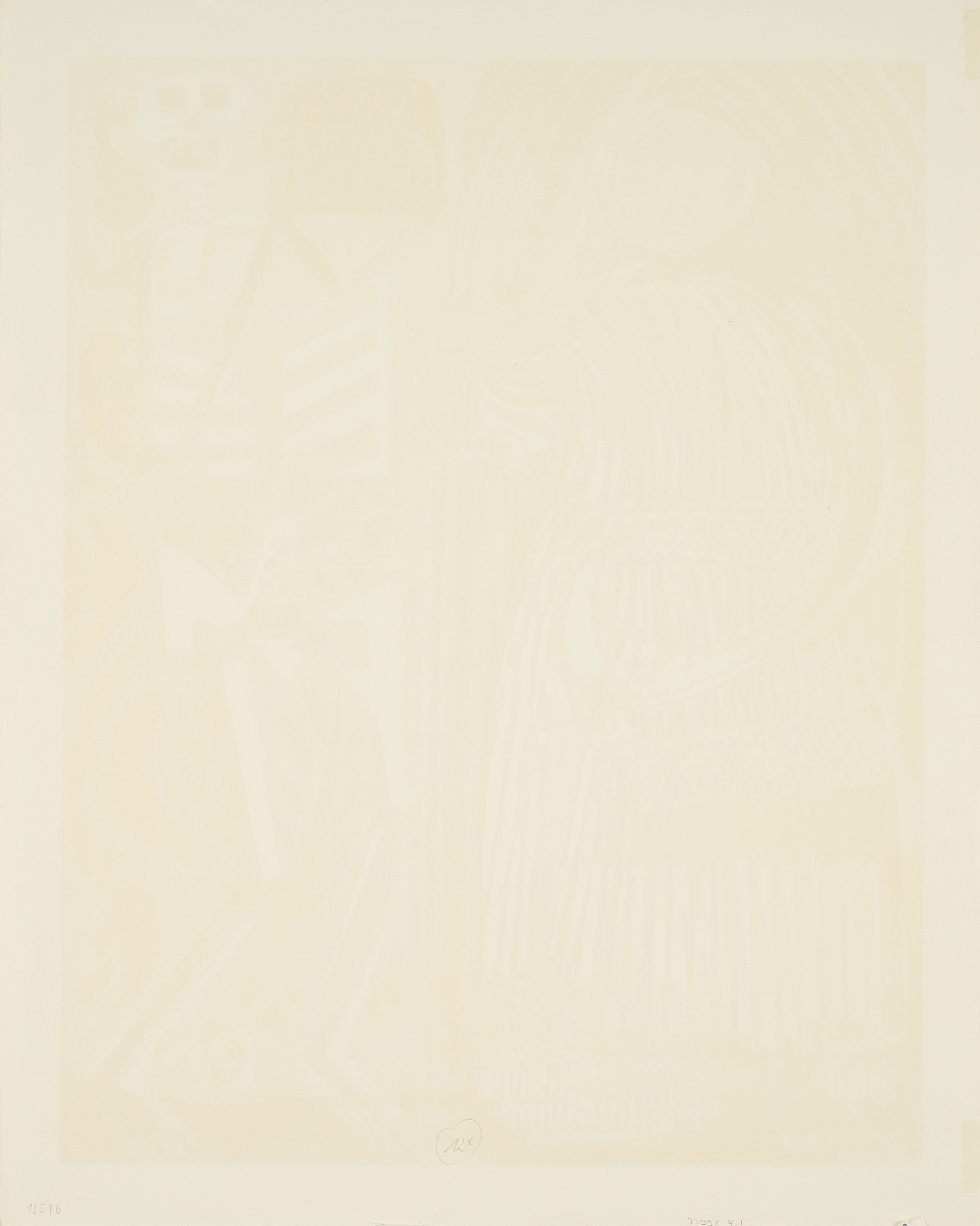 Bestoßung mit Einriss (ca. 1cm) unten links. Zwei leichte Bestoßungen am unteren Rand. Eine leichte Bestoßung am oberen Rand. Leichte Knickspur oben rechts. Leichte Verschmutzung am linken Rand mittig. Minimale Verschmutzung am rechten Rand mittig. Minimal gebräunt und minimale Verschmutzungen an den Kanten. Verso Reste alter Montierung sowie minimal gebräunt. Ansonsten guter Zustand.