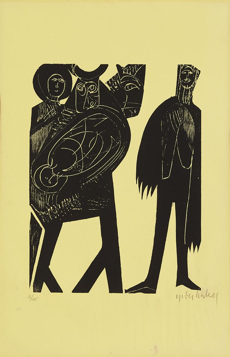 Krippe. 1964. Holzschnitt auf gelbem CANSON & MONTGOLFIER - VIDALON-LES-ANNONAY (Wasserzeichen). 32 x 24cm (50 x 32cm). Ex. 16/35. Signiert und nummeriert.