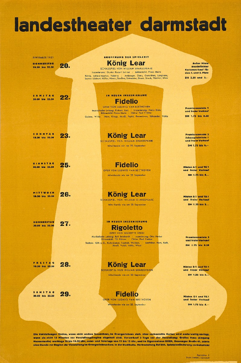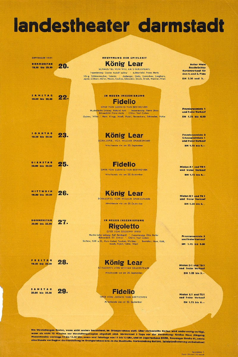 Landestheater Darmstadt. 1951. Plakat zur Eröffnung der Spielzeit 1951/52. Lithographie auf ABONBA (Wasserzeichen). 51 x 35cm (61 x 41cm). - Minimale Knickspuren sowie Stauchungen.