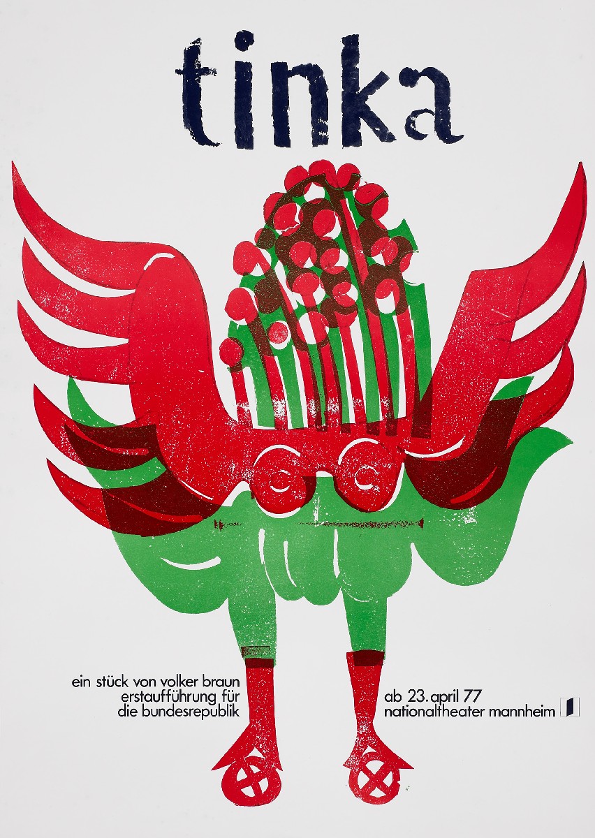 Tinka (Entwurf und Druckvorlage). Ca. 1977. Entwurf: Mischtechnik (Bleistift, Farbkreide, Aquarell, Papiercollage) auf Karton. 43,5 x