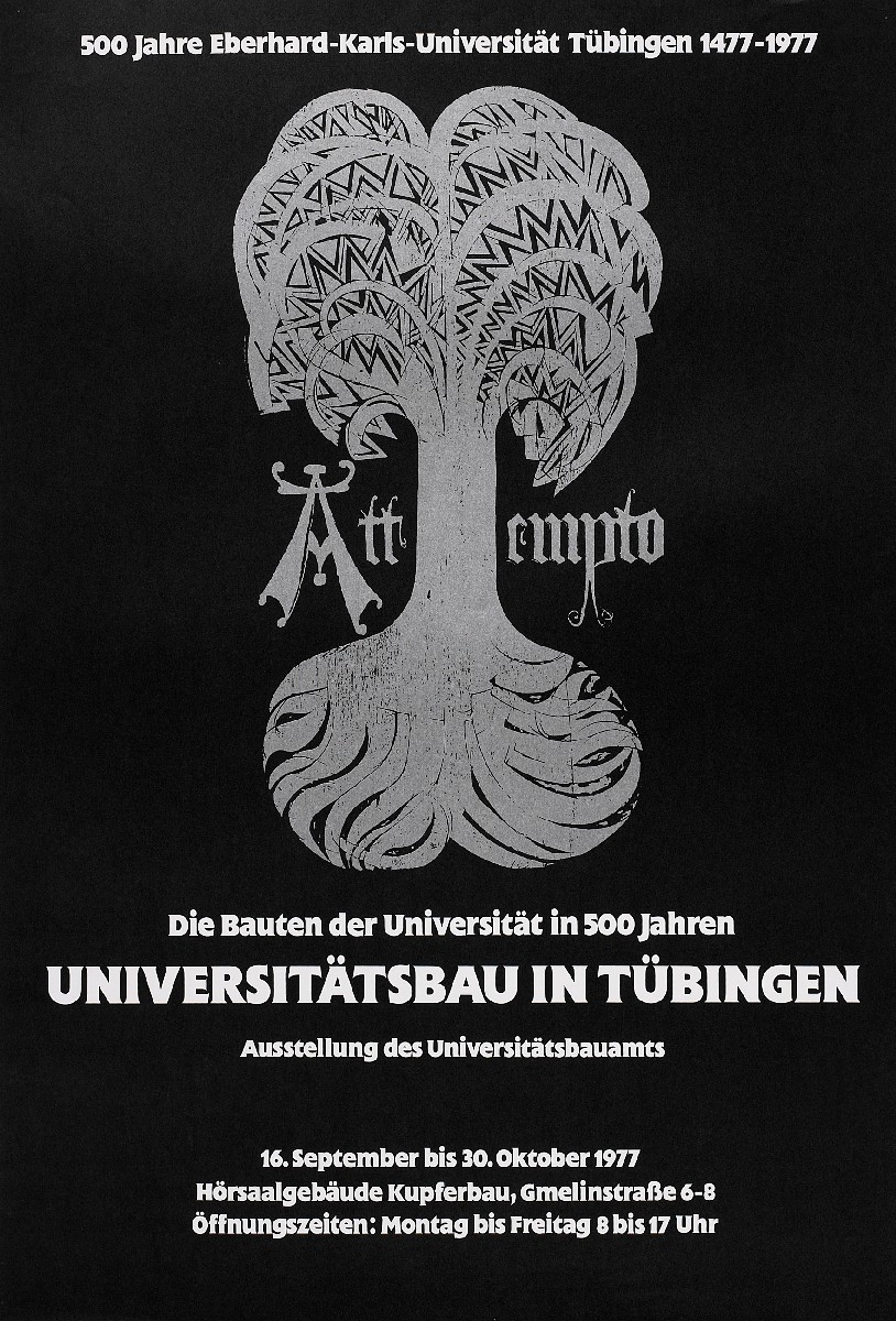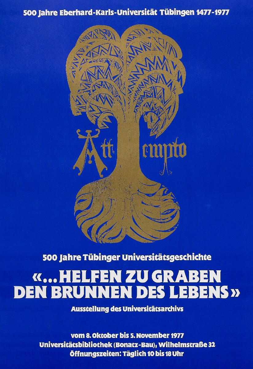 Universität Tübingen - 500 Jahre Eberhard-Karls-Universität Tübingen 1477-1977. 1976. Konvolut von 46 Plakaten mit individuellem Texteindruck. Verschiedene Farbvariationen.