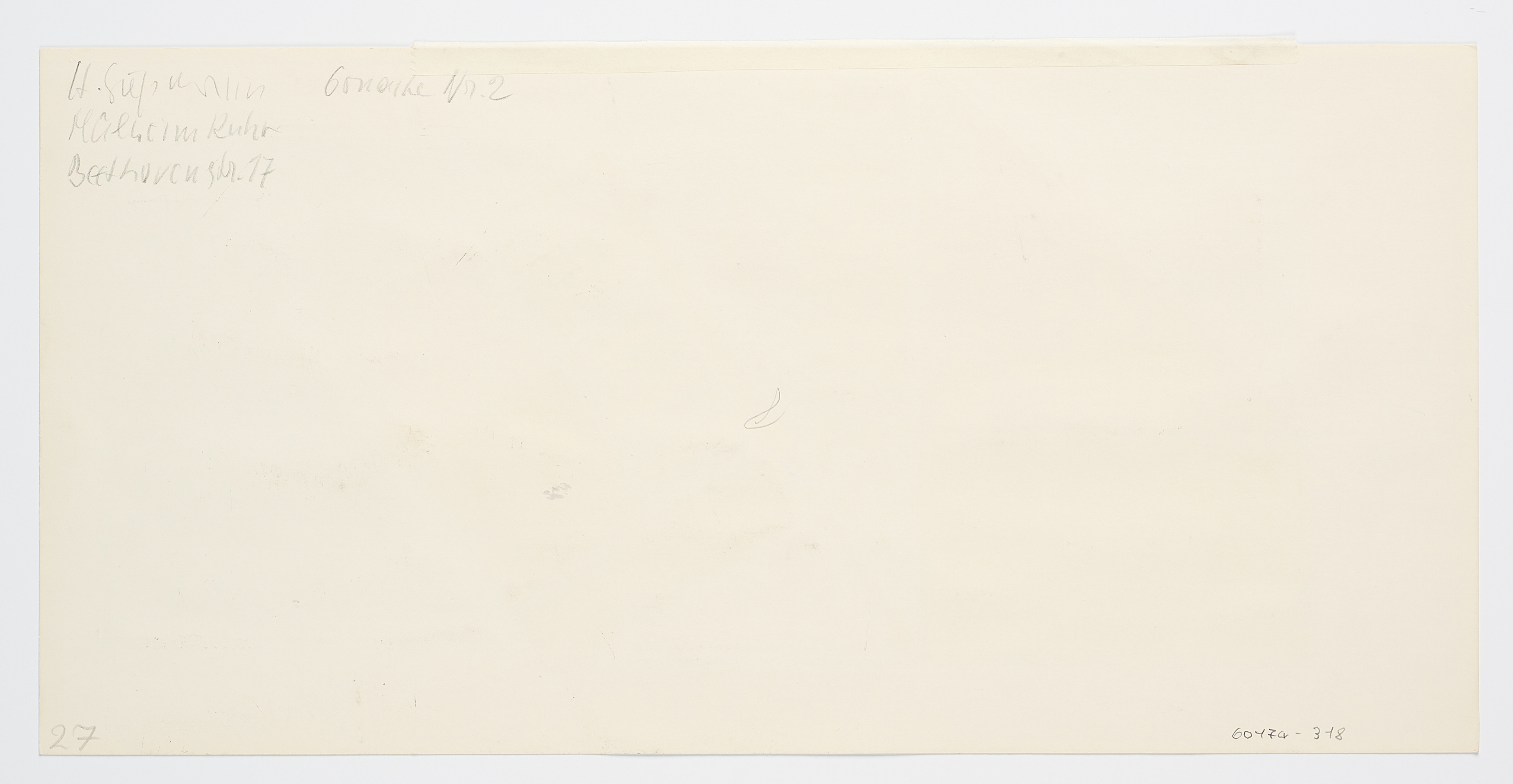 Blatt arbeitsbedingt leicht gewellt. Minimale Knickspur in der linken unteren Ecke. Minimale Griffspur am rechten Randbereich mittig. Verso Reste alter Montierung entlang der oberen Kante. Minimal verschmutzt. Ansonsten guter Zustand.