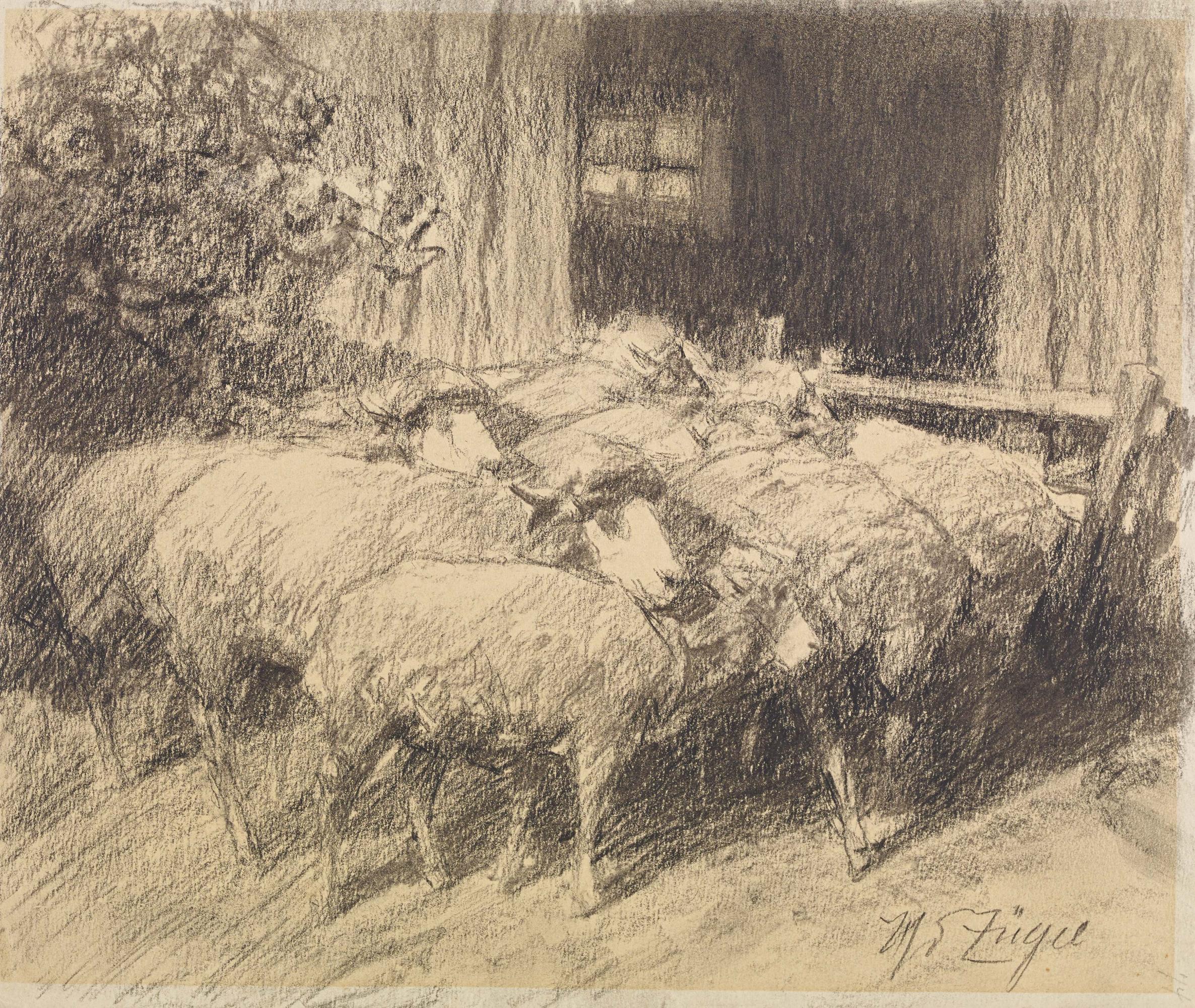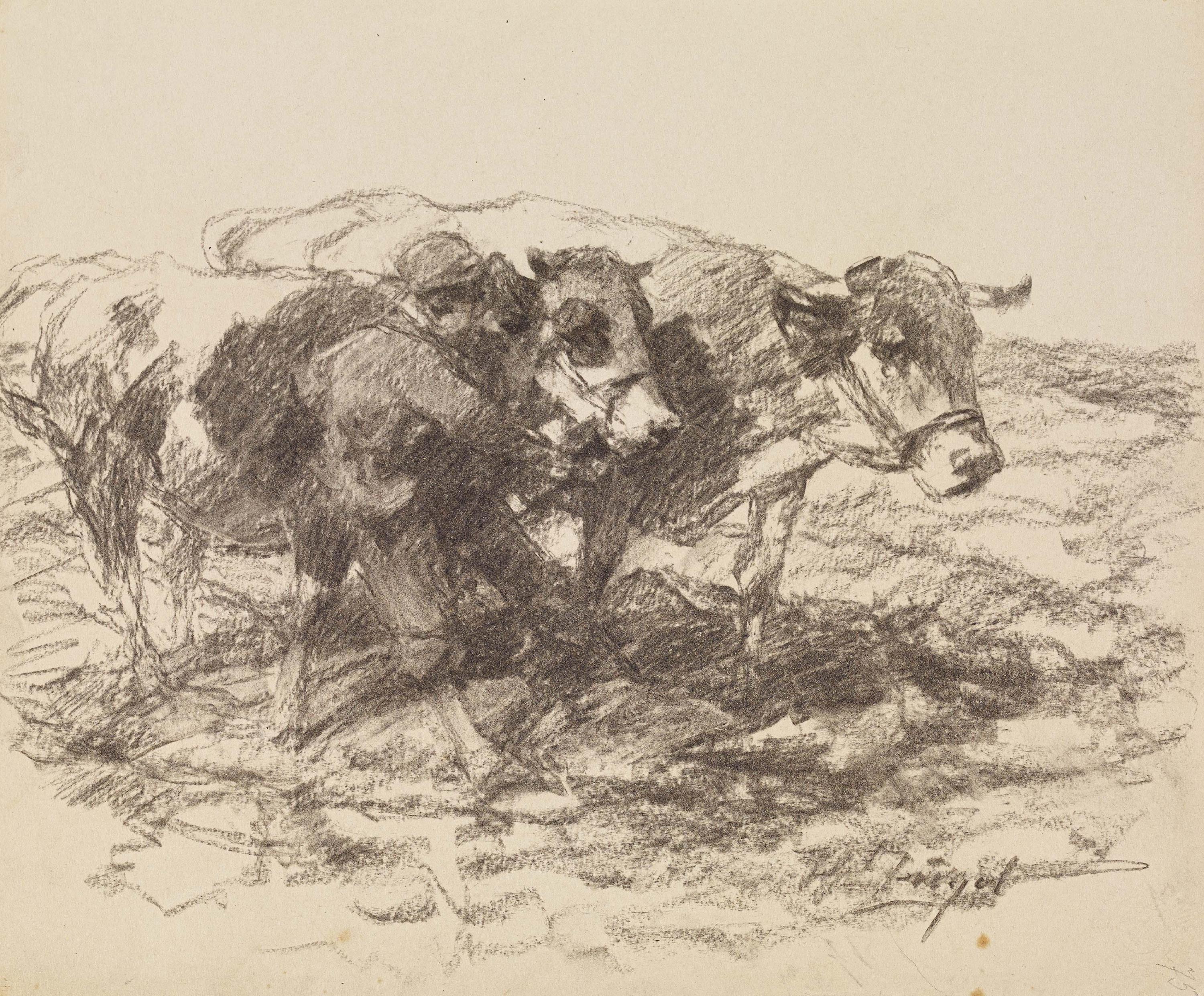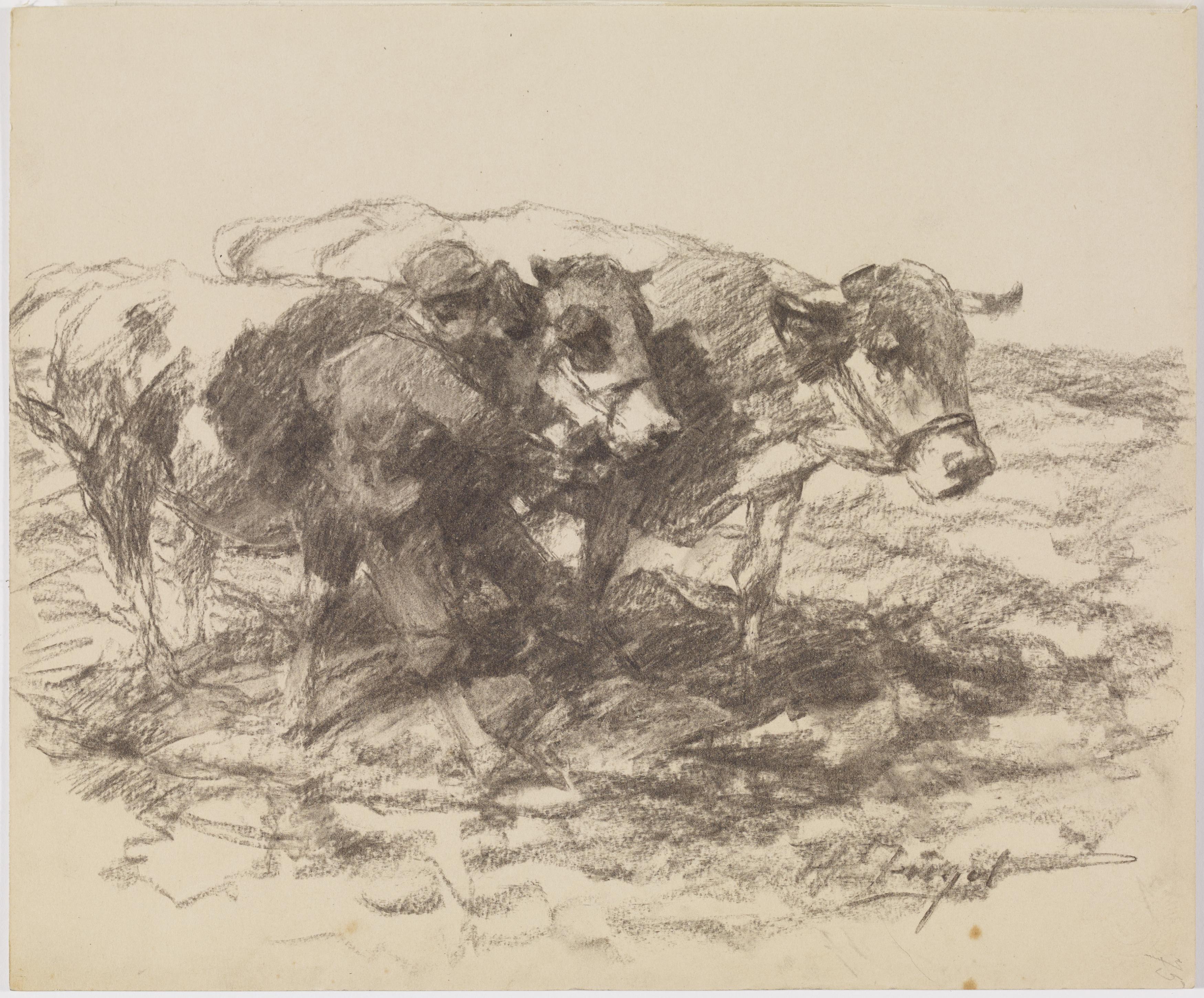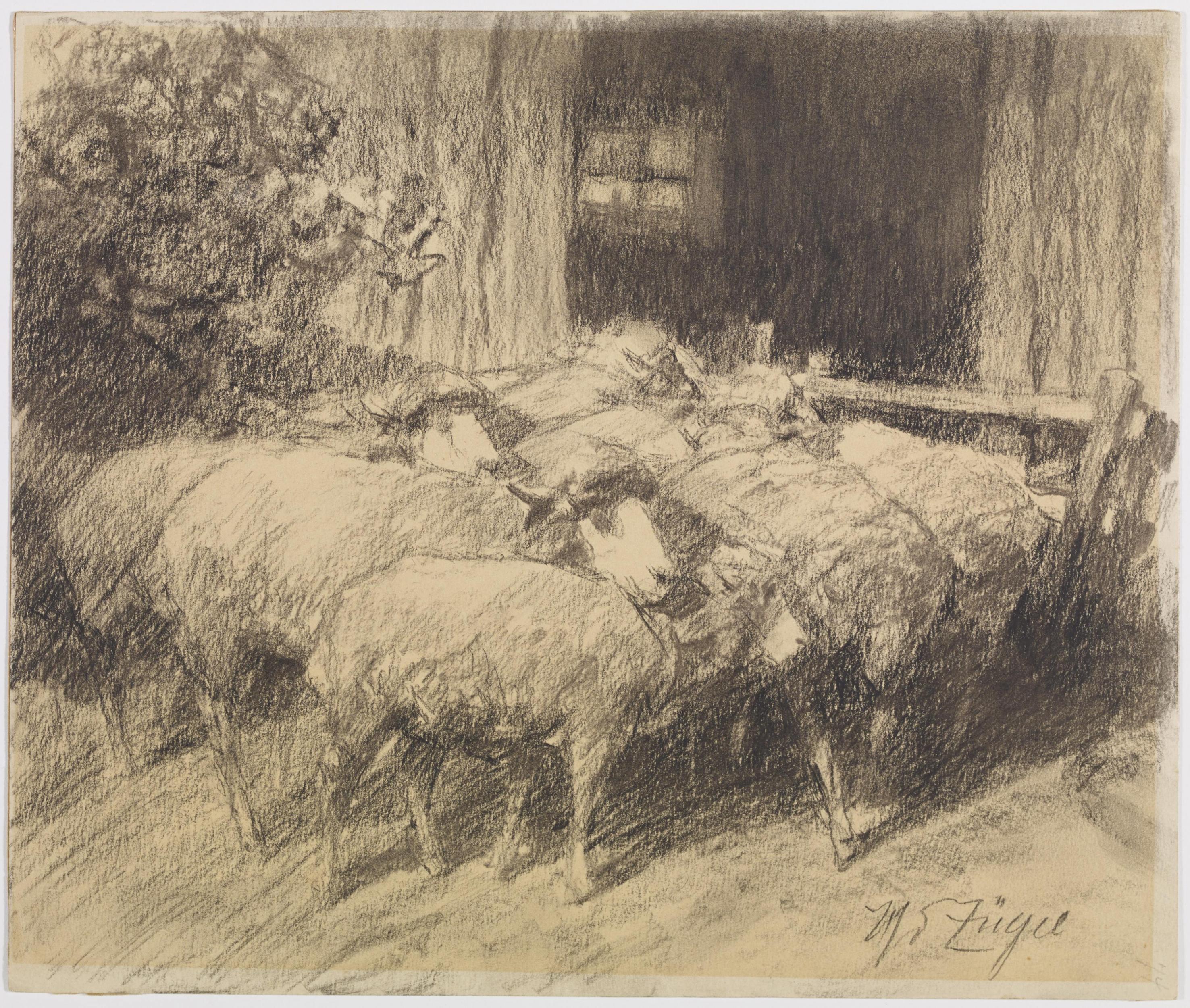 Titel: Zwei Kohlezeichnungen: Ochsengespann / Schafe vor der Stalltür.