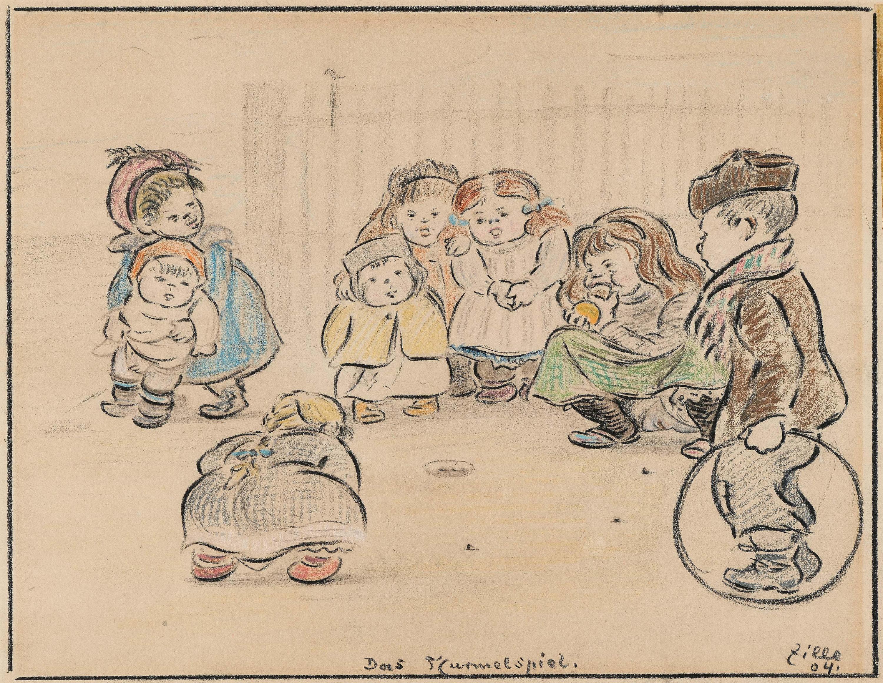 Bezeichnung: Signiert und datiert unten rechts: Zille 04. Betitelt unten mittig: Das Murmelspiel.