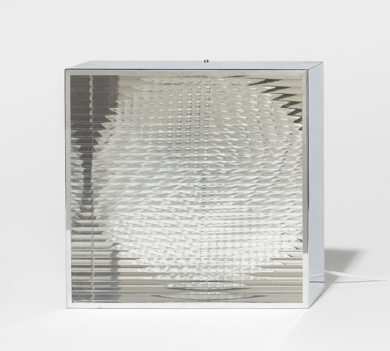 Ohne Titel (Licht-Rotor). 1971 (?). Kinetisches Objekt. Aluminiumscheibe, Elektromotor, Wellenglas, in Metallkasten (verchromt).