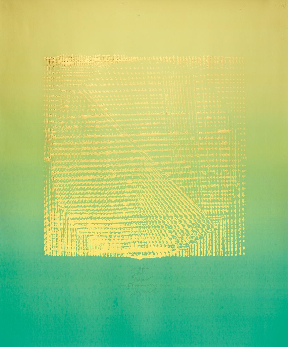Galaxis. 1973. Farbserigrafie und Prägedruck auf Aluminium-Folienkarton. 35 x 35cm (60 x 50cm). Signiert und gewidmet. Propyläen Verlag Berlin, Wien (Hrsg.). Rahmen.