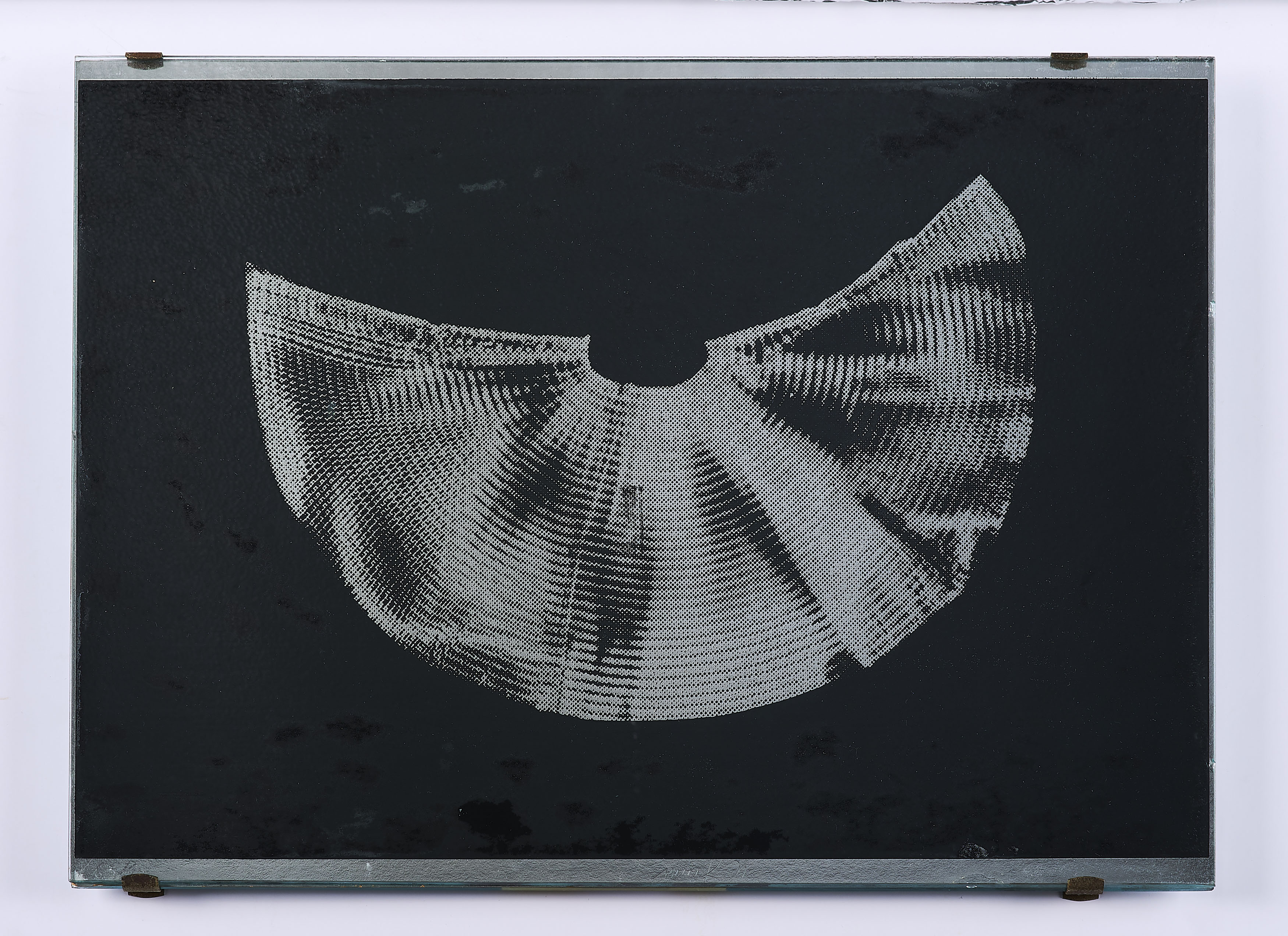 Oberfläche überwiegend fleckig. Blatt haftet deutlich am Glas. Leichte Bereibungen, vor allem an den Ecken. Im Rahmen beschrieben.