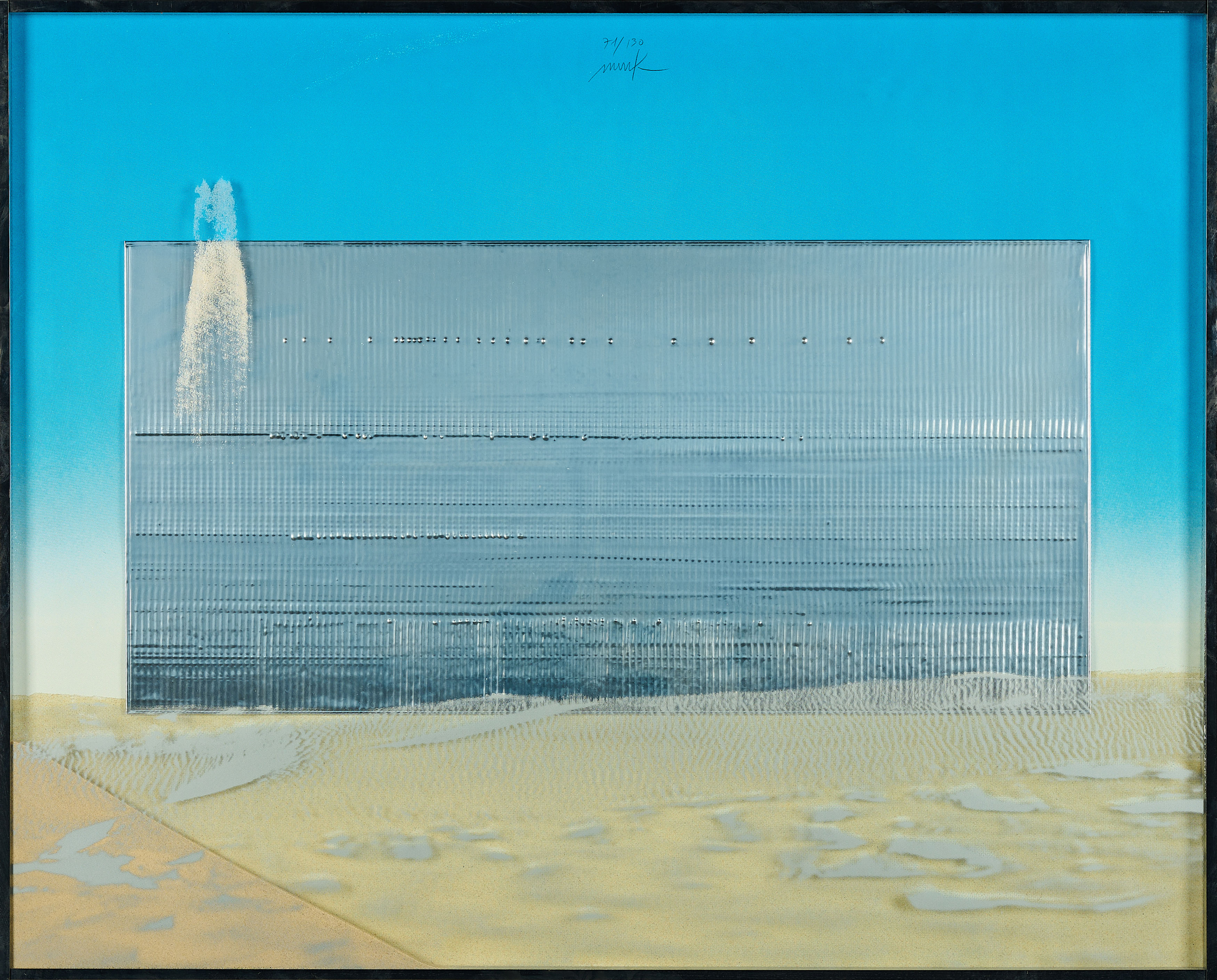 Technik: Serigrafie innen auf der Glasplatte. Über Aluminium-Relief auf Hartfaser. Über Farbserigrafie und Irisdruck. Zwischen Glasplatte und Bildgrund sogenannter Vogelsand.