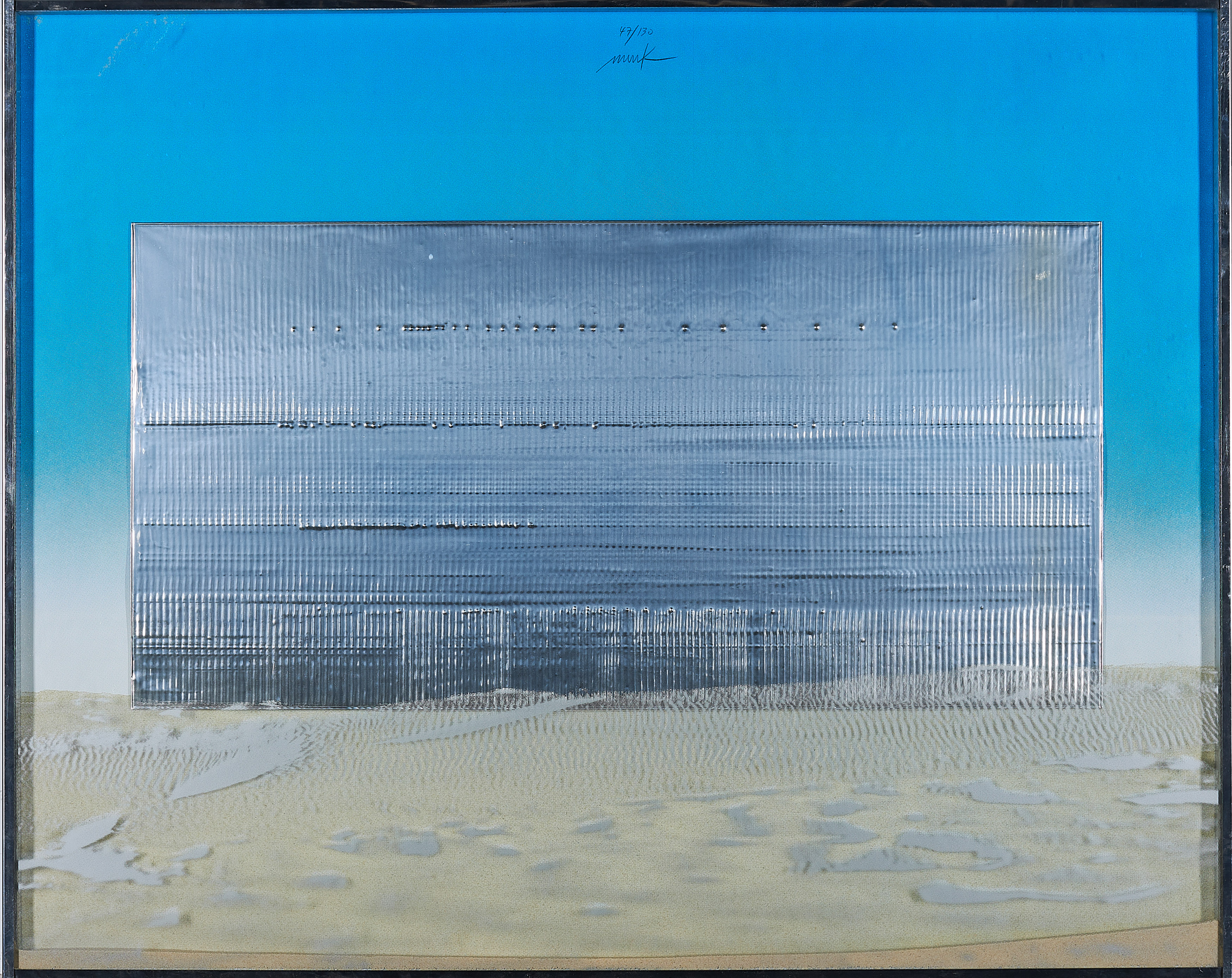 Technik: Aluminiumrelief auf Hartfaser, collagiert auf Farbserigrafie. Darüber Serigrafie auf der Innenseite des Glases und Vogelsan, in Aluminiumrahmen.