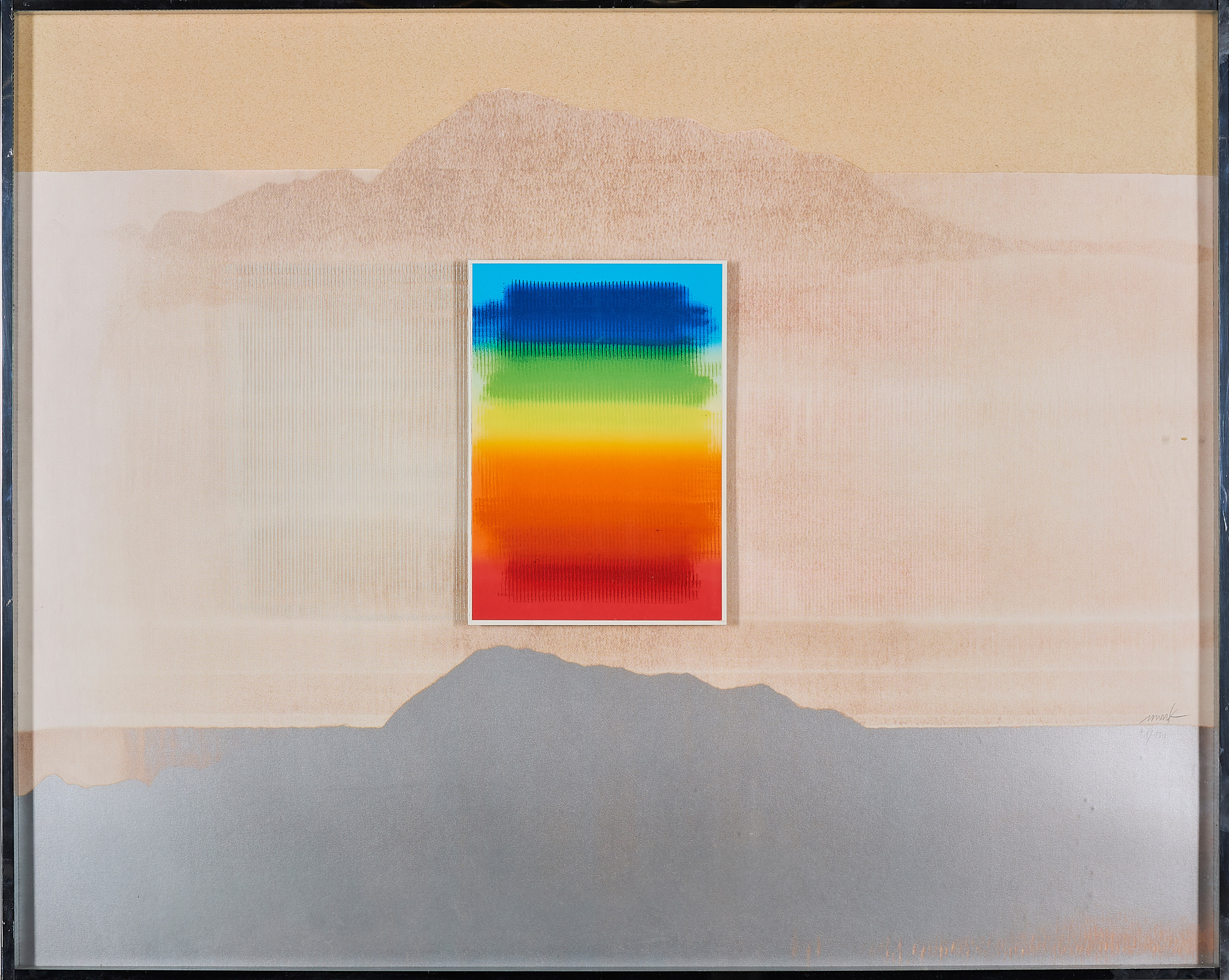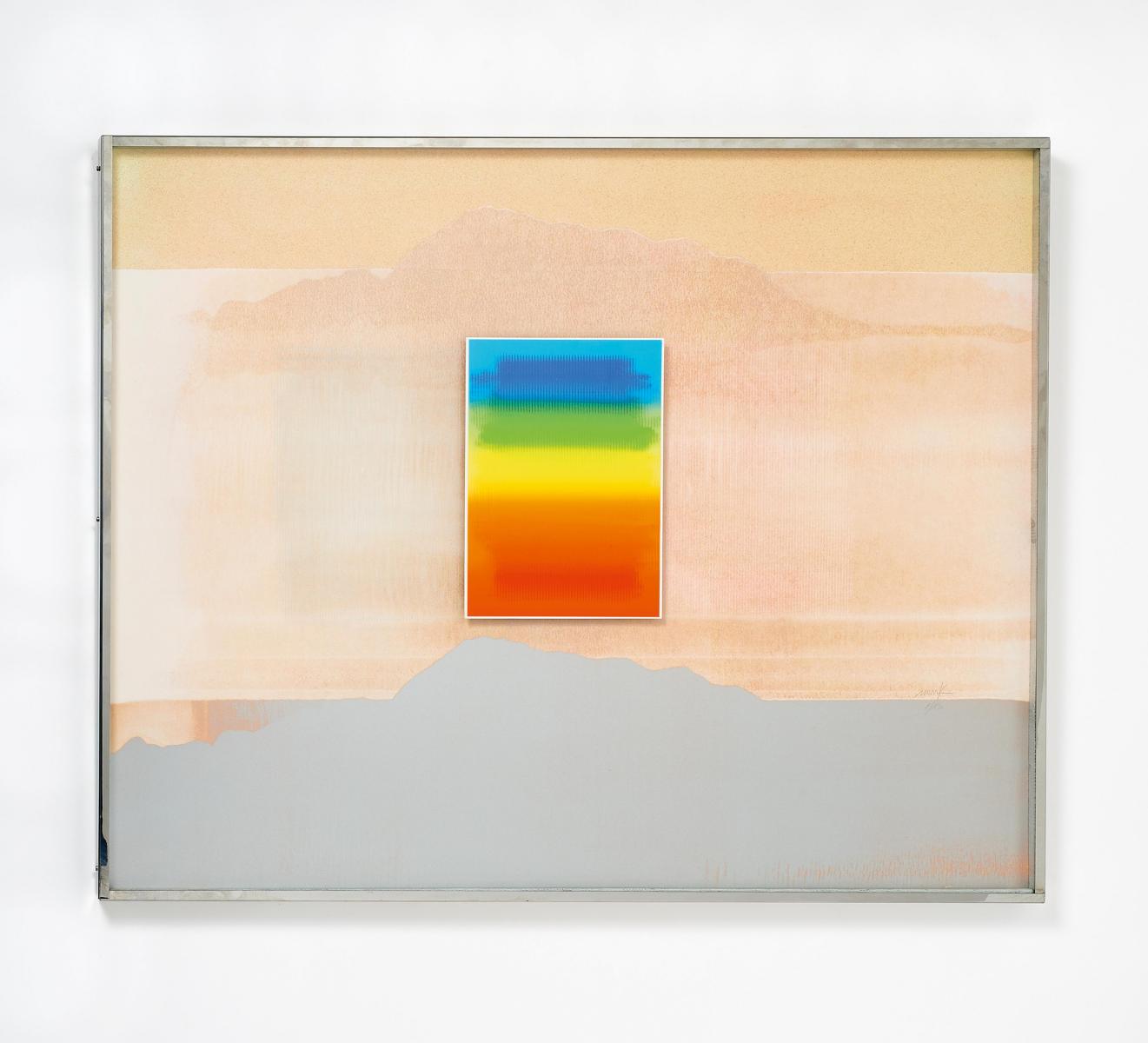 Technik: Offset auf Pappe, collagiert auf Farbserigrafie und Sand. Darüber Serigrafie auf der Innenseite des Glases, in Aluminiumrahmen.