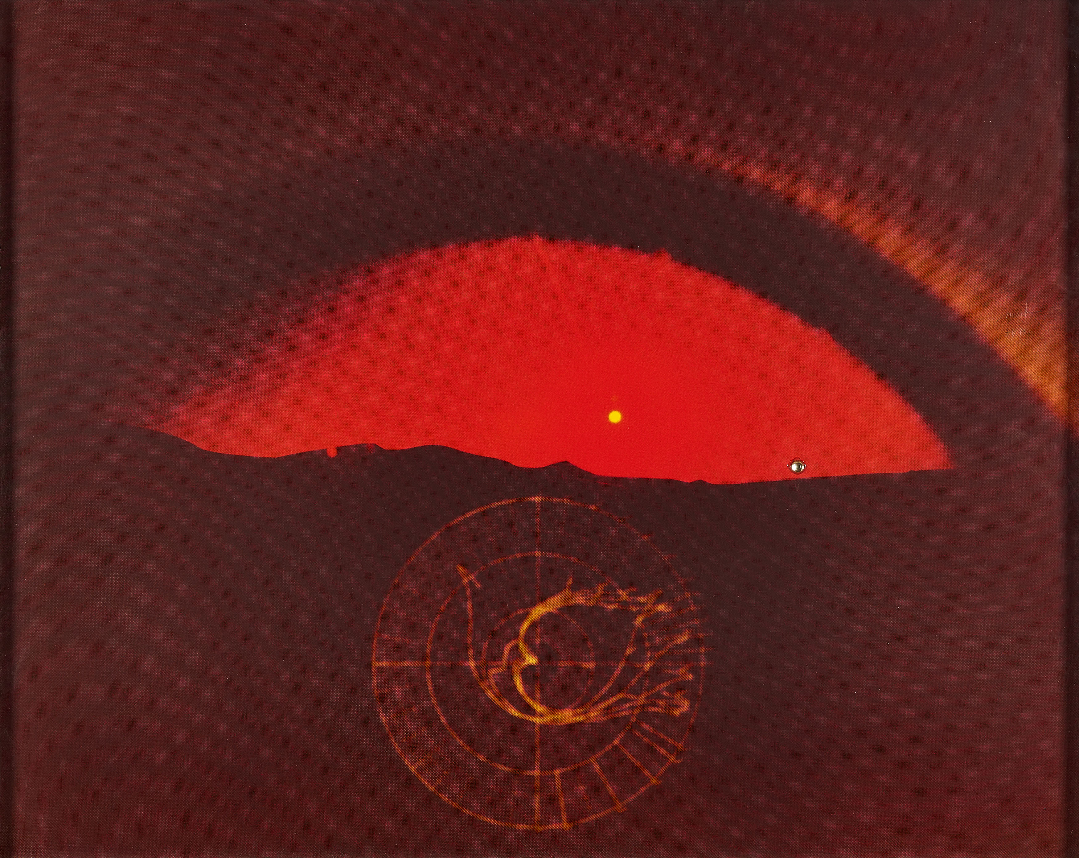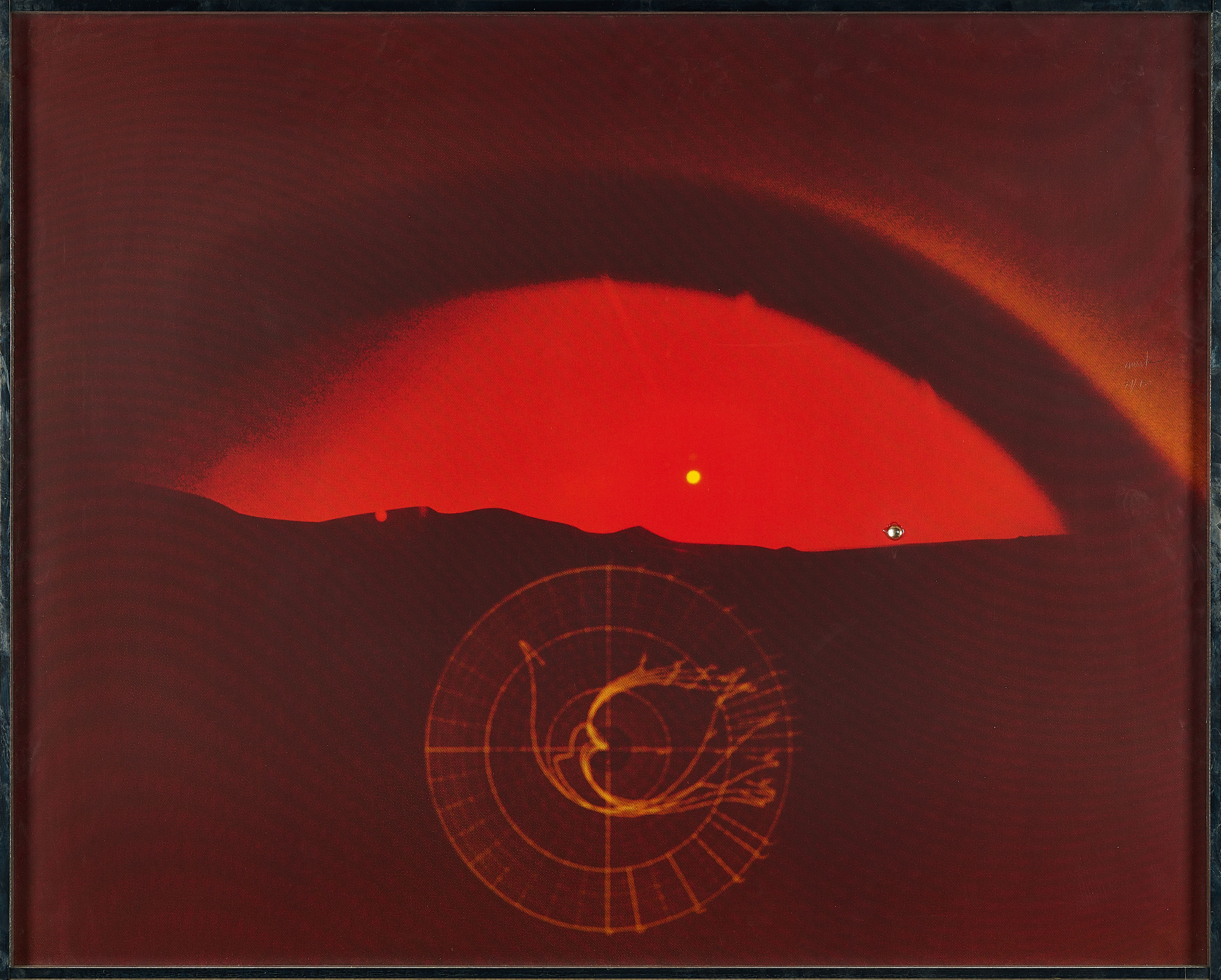 Technik: Gläserne Halbkugel, collagiert auf Farbserigrafie auf leichtem Karton.