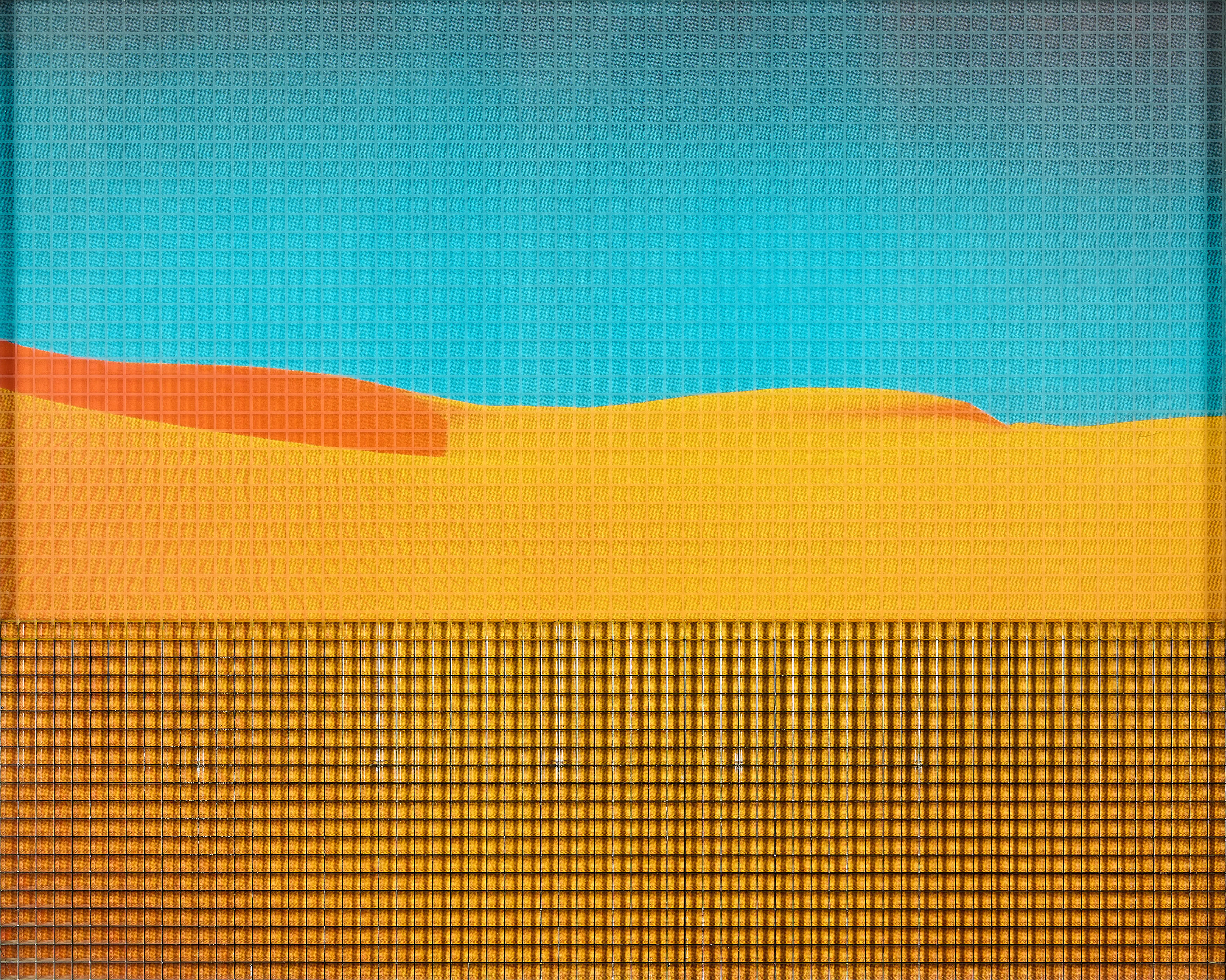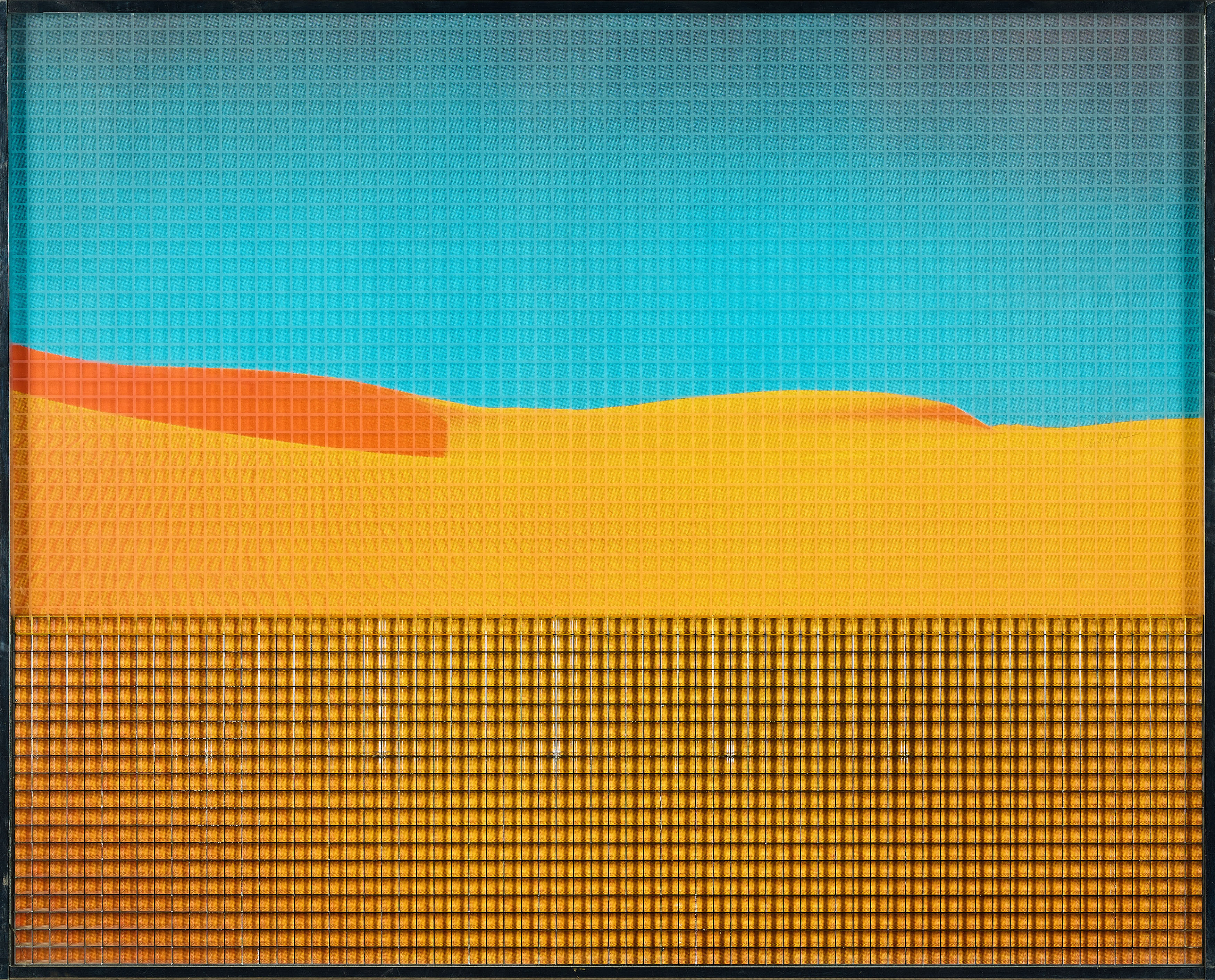 Technik: Serigrafie innen auf der Glasscheibe über quecksilberbedampftem Kunststoffgitter auf Farbserigrafie auf leichtem Karton.