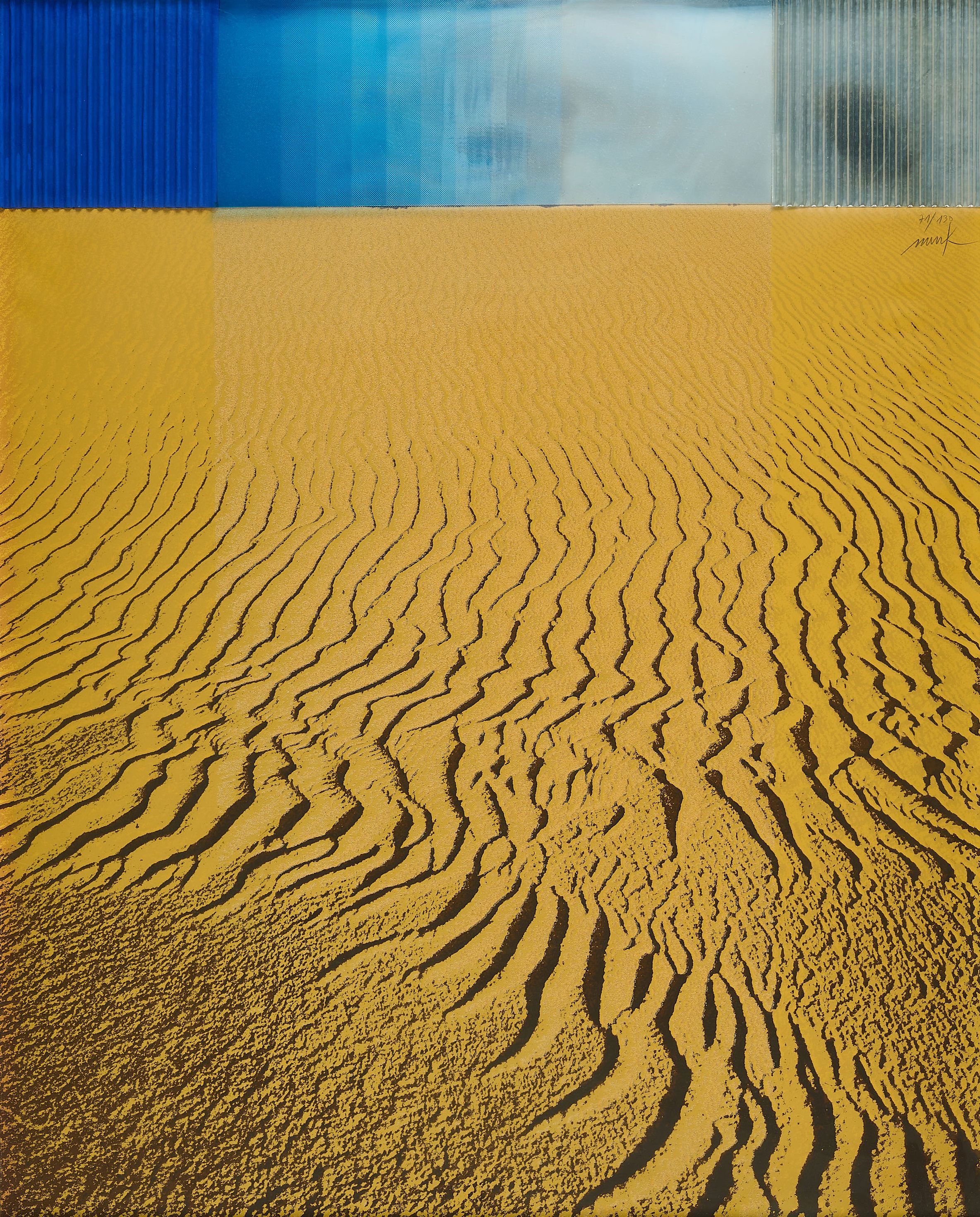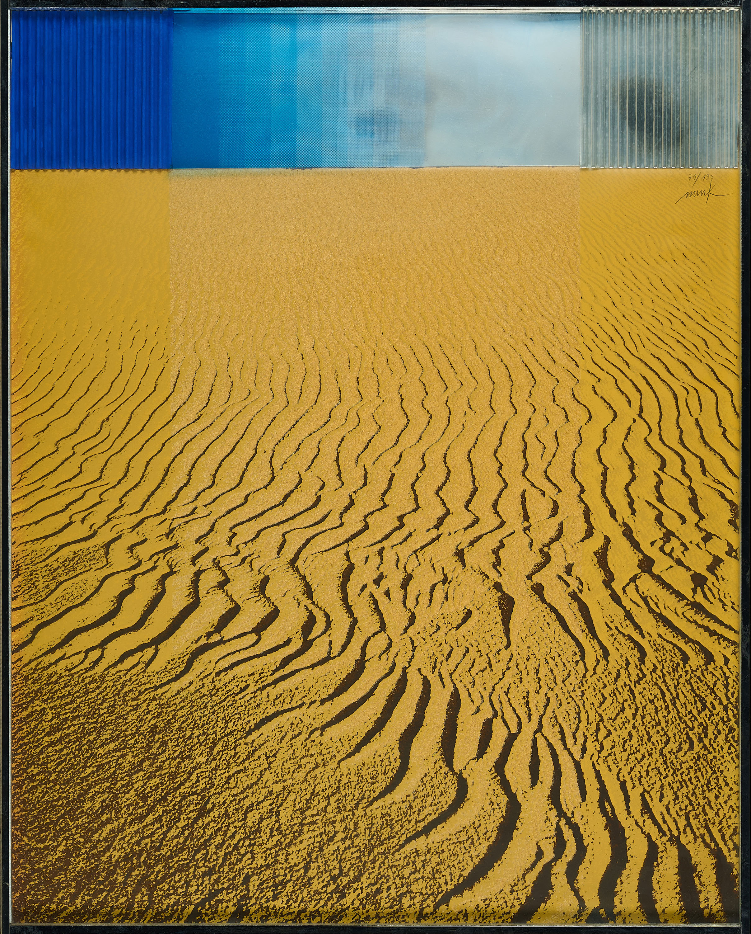 Technik: Farbserigrafie innen auf Glasplatte über blau eingefärbter Wellpappe und Aluminiumrelief auf Farbserigrafie mit Sahara-Sand auf leichtem Karton.