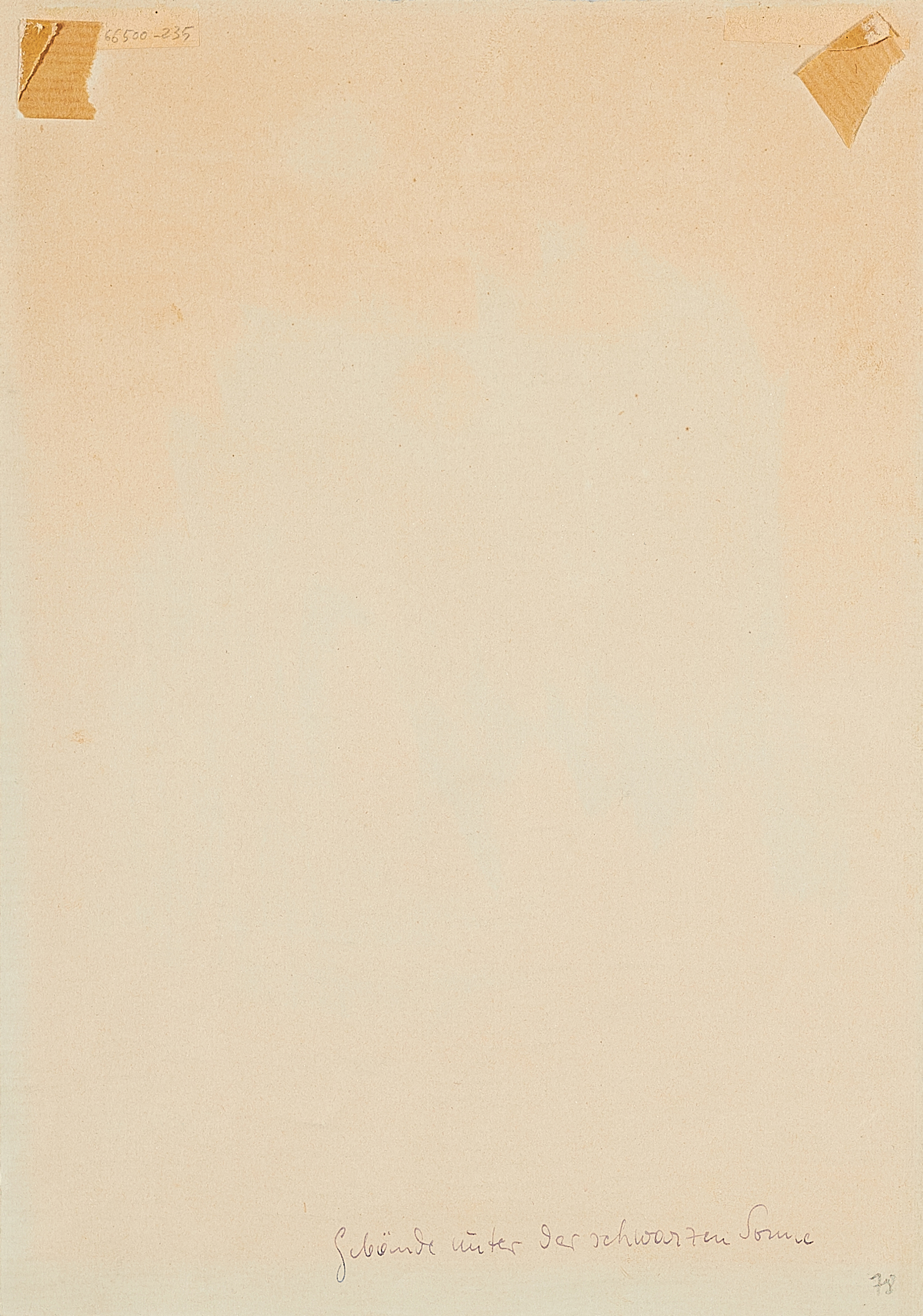 Bezeichnung: Signiert und datiert unten rechts: Trökes 48. Verso betitelt: Gebäude unter der schwarzen Sonne.