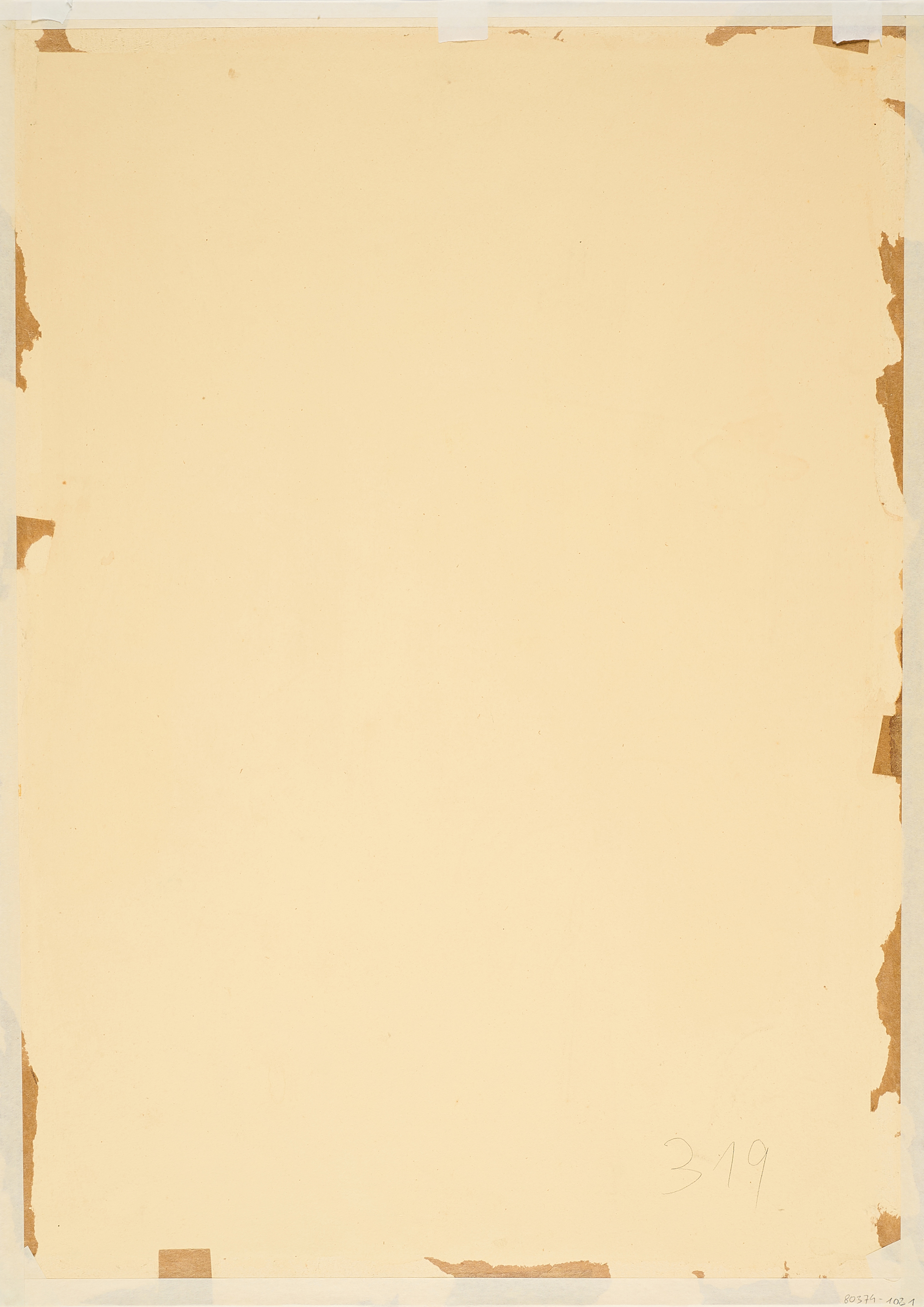 Leicht gebräunt mit Lichtrand. Randbereiche mit bräunlichen Verfärbungen und Fingerschmutz. Oben links schwache Knickspur. Recto und verso Reste und Spuren alter Montierung. Ansonsten guter Zustand.
