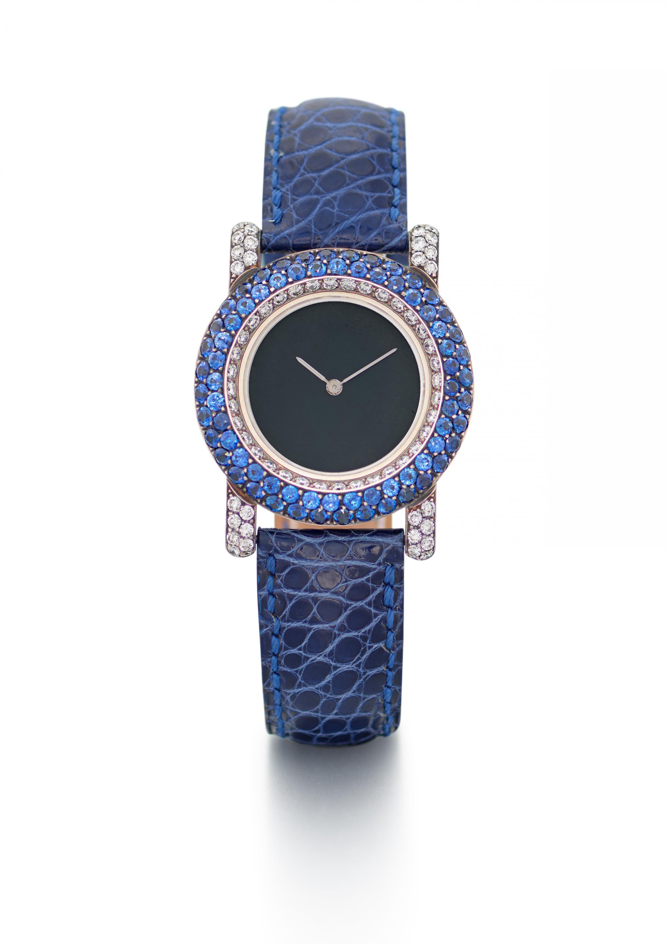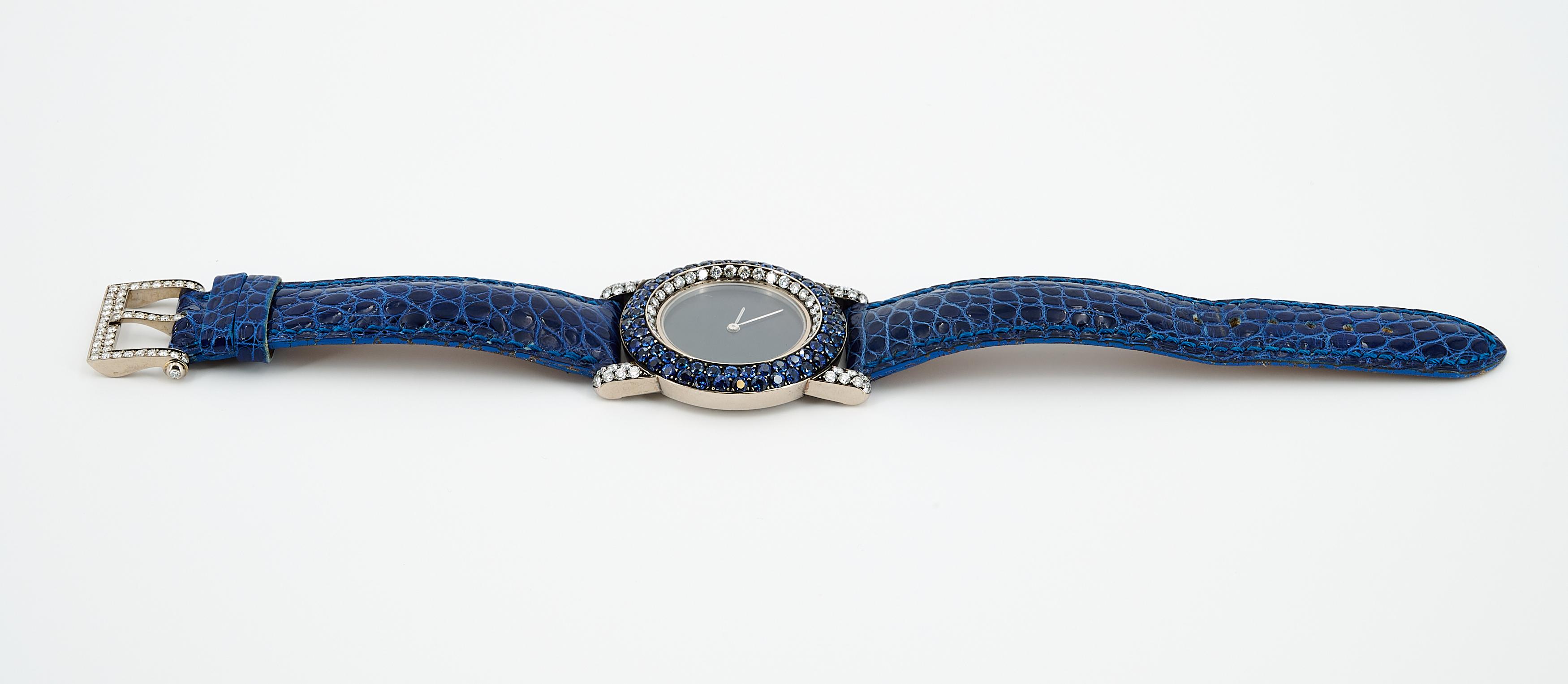 Beschreibung: 2-Zeiger-Armbanduhr besetz mit 111 Brillanten zus. ca. 2,9 ct. und 72 Saphiren zus. ca. 3,6 ct.