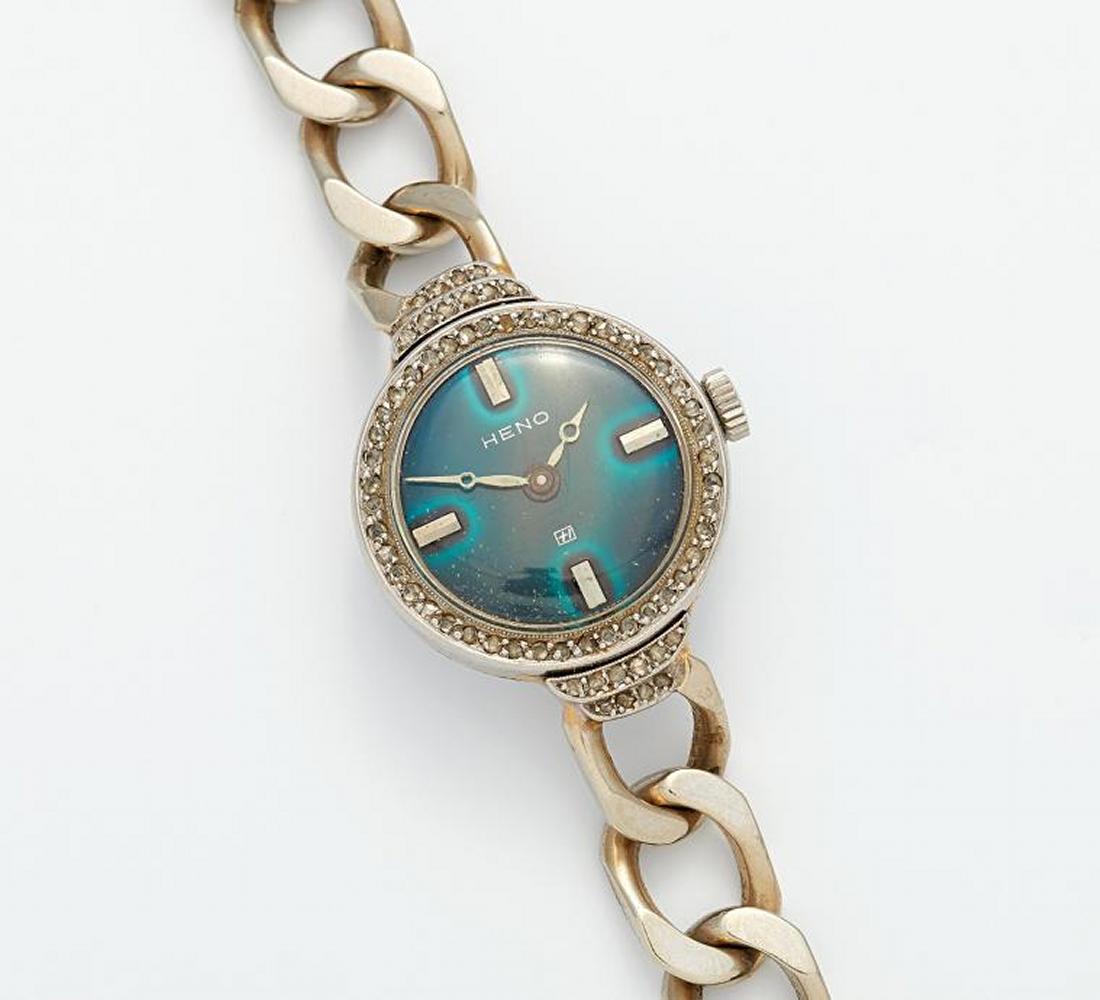 Handaufzug. 750/- Weißgold, Zffbl. grün, Zeiger weiß, Indizes silbern, Lünette/Bandanstöße diamantgeziert. Gewicht: 50,0g. L.ca. 20,0cm, D.ca. 2,2cm.