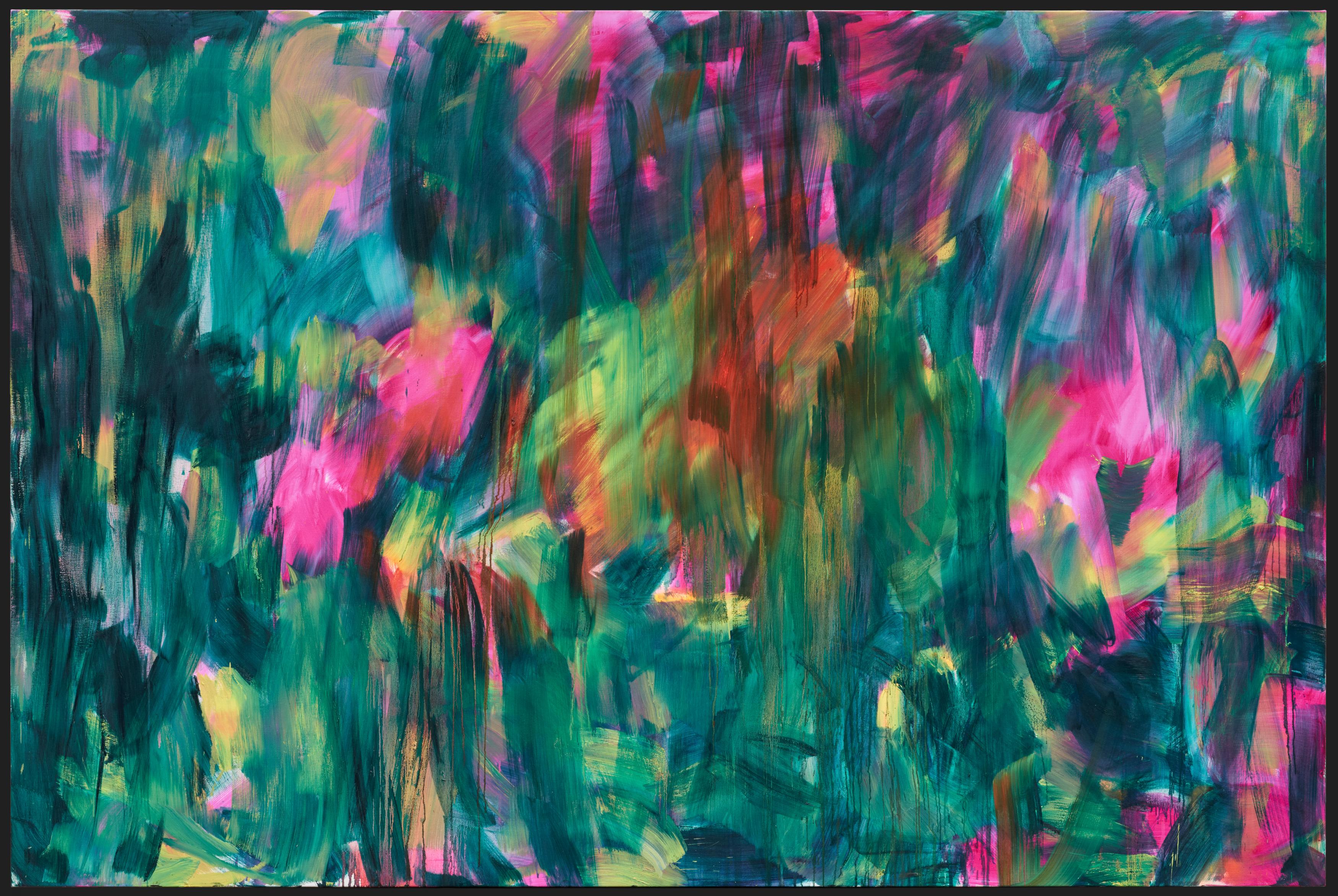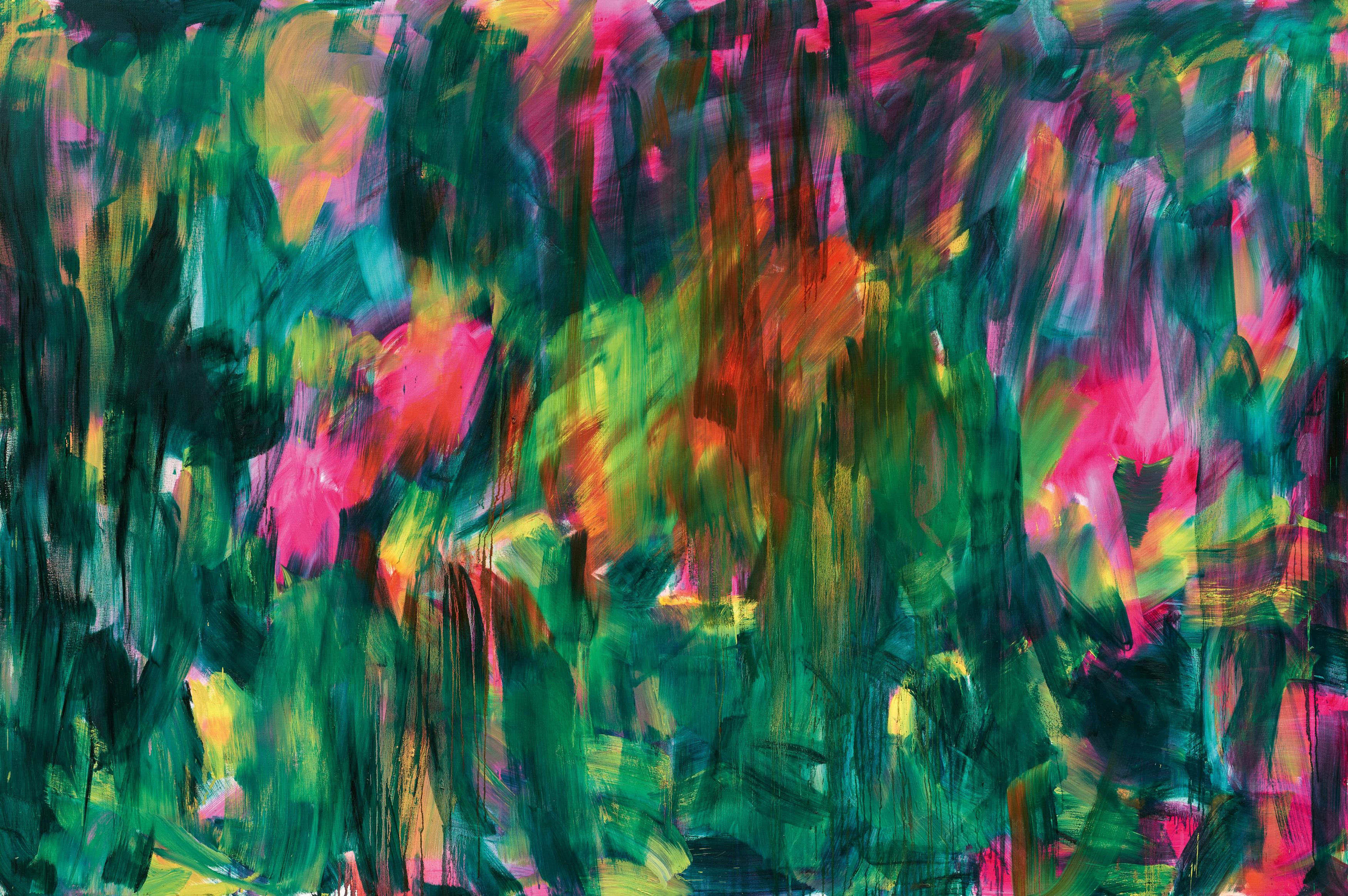 So ist das Motiv des vorliegenden Gemäldes kaum bestimmbar. Sind exotische Blüten dargestellt, die durch das dichte grüne Blätterwerk des Dschungels aufleuchten? In eine reine Impression verwandelt, dominiert ein farblicher Dreiklang aus Magenta, Petrol und Gelb das Bild. Die Zweidimensionalität der Leinwand wird durch einen wechselnden Tiefeneindruck durchbrochen, der einzig durch farbperspektivische Effekte zustande kommt: In der Wahrnehmung suggerieren die warmen rot- und gelbhaltigen Farben eine Nähe, während die kalten, türkishaltigen Farben eher in der Ferne verortet werden. Vor- und zurückspringende Pinselstriche versetzen die Bildfläche in vibrierende Bewegung. Das intensive Flimmern des Kolorits erinnert an Monets flüchtige Beobachtungen seines Gartens in Giverny oder an die ekstatische Glut wirbelnder Farbstrudel, mit denen William Turner Licht und Atmosphäre schafft. "[.] im Grunde geht es mir darum, ob ein Flirren entsteht, ob es eine Harmonie gibt und ob die Pinselstriche einen Fluss kriegen und miteinander kommunizieren." (Herbert Brandl zit. nach "Es ist alles verbunden, wie ein riesiger Körper" in: Kurier, 26.01.2020).