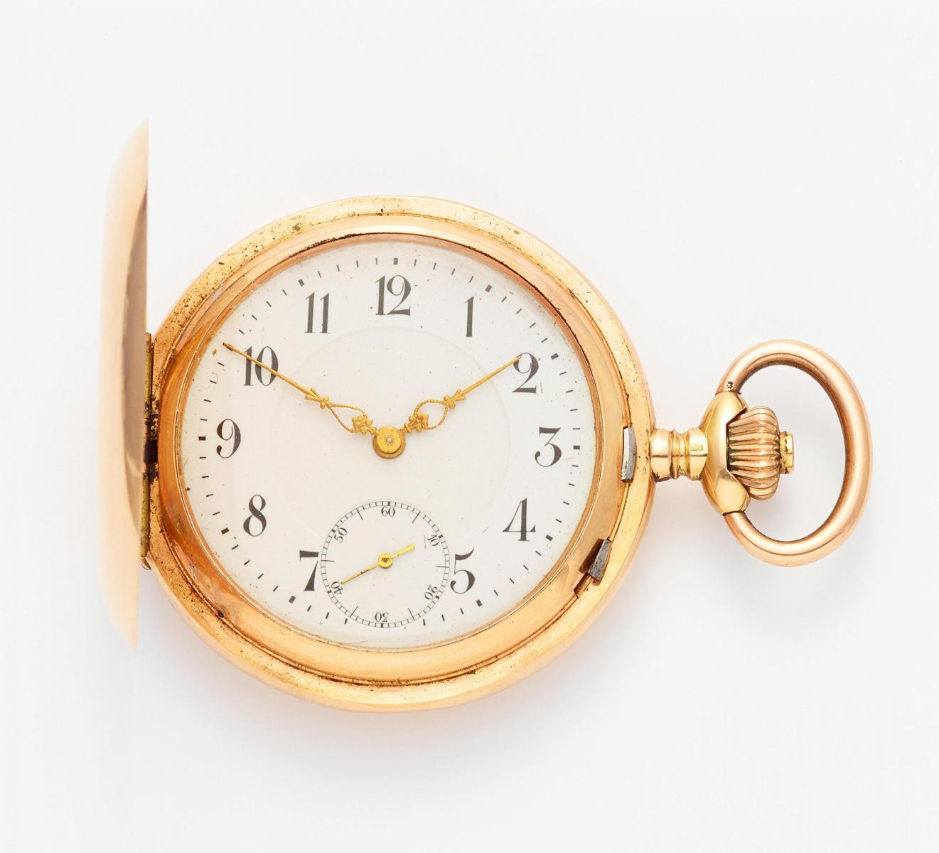 Gehäuse/Armband: 585/- Rotgold, Zffbl. Email, Zeiger golden.