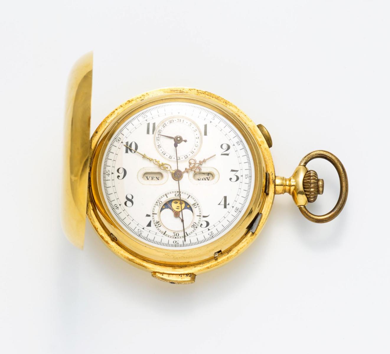 Beschreibung: Herrensavonette mit Chronographenfunktion, Repetition, Mondphase, Tages- und