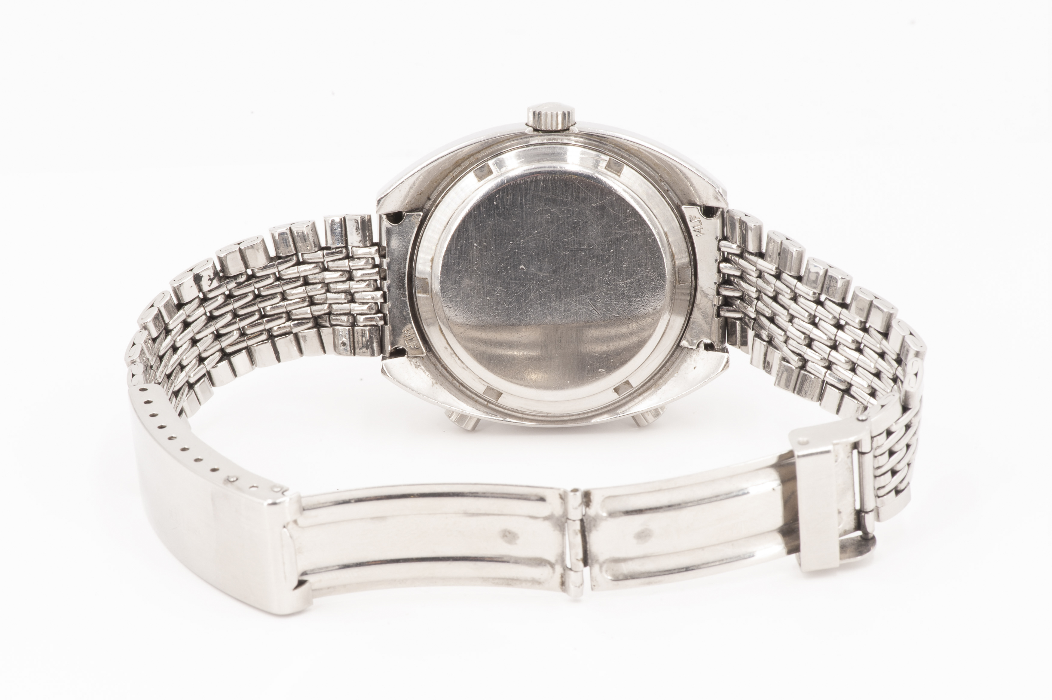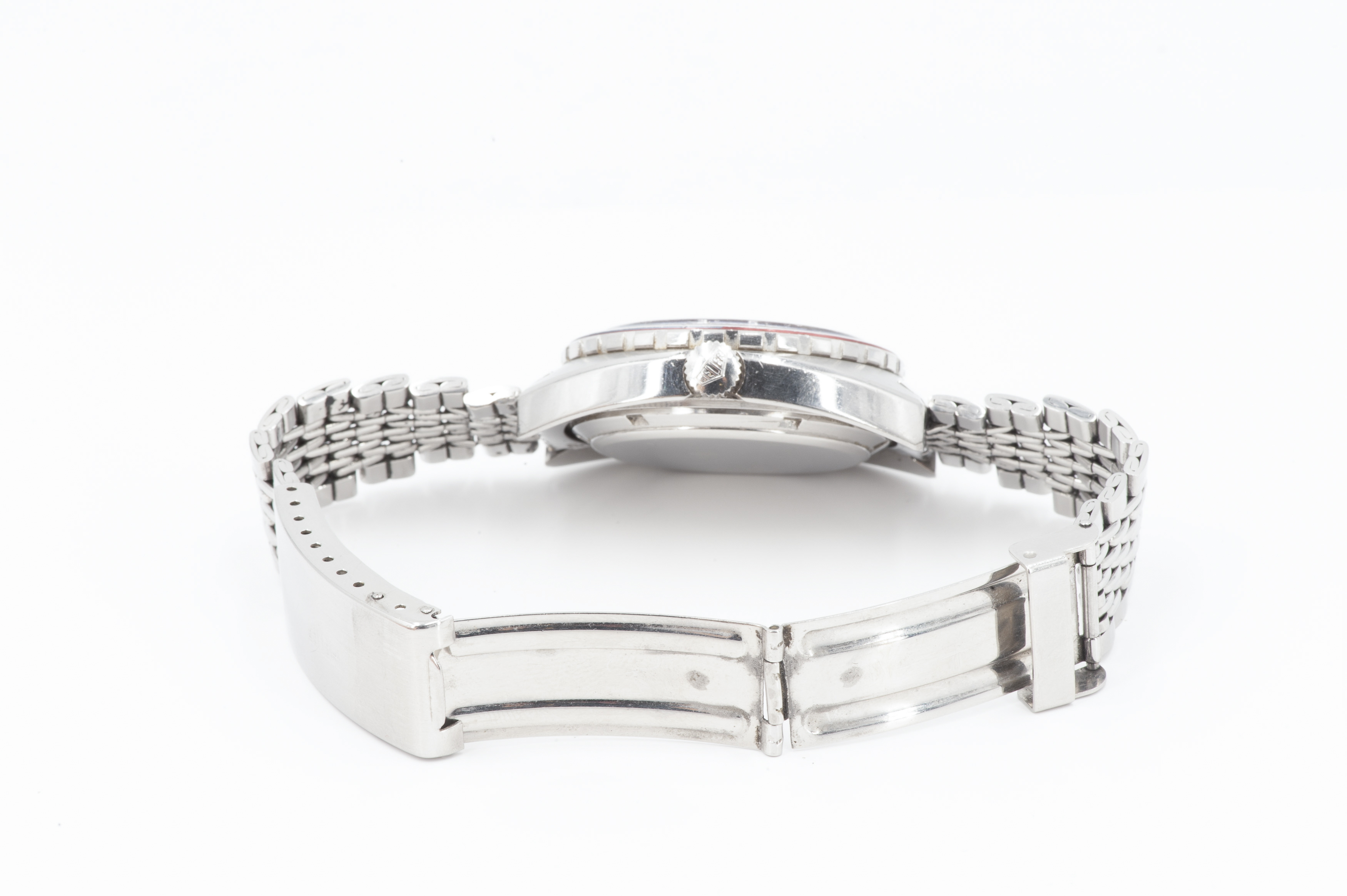 Gehäuse/Armband: Stahl, Gliederarmband mit Faltschließe, Zffbl. schwarz-matt, Zeiger rot/gelb, Indizes silbern, beidseitige Drehlünette.