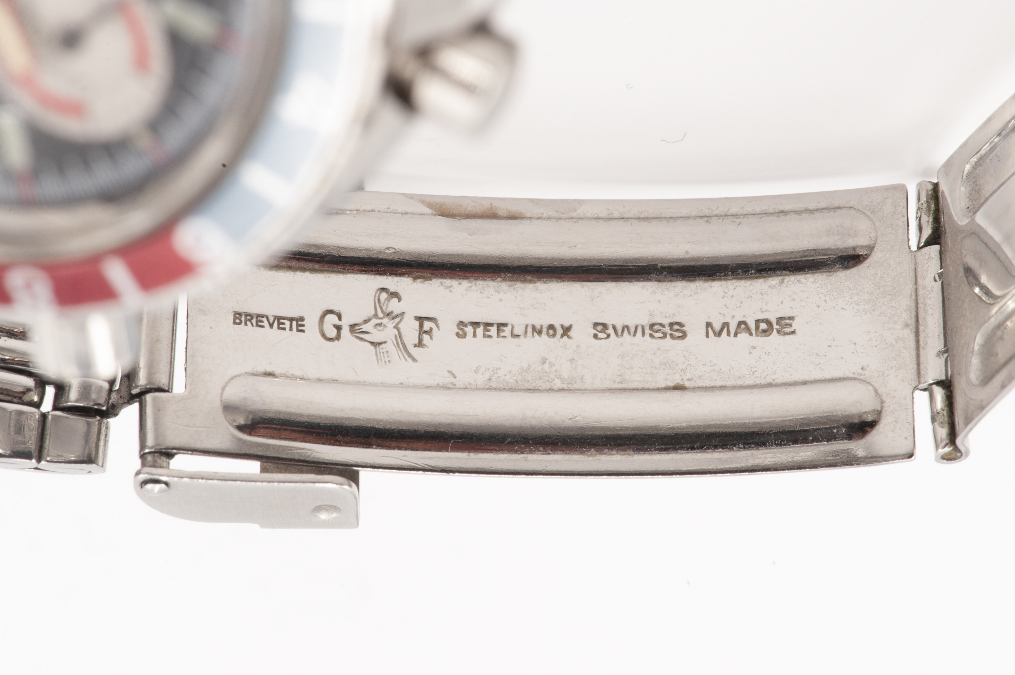 Beschreibung: 4-Zeiger-GMT Chronograph, Totalisator mit 30-Minutenanzeige bei "3" Uhr, Datumsanzeige bei
