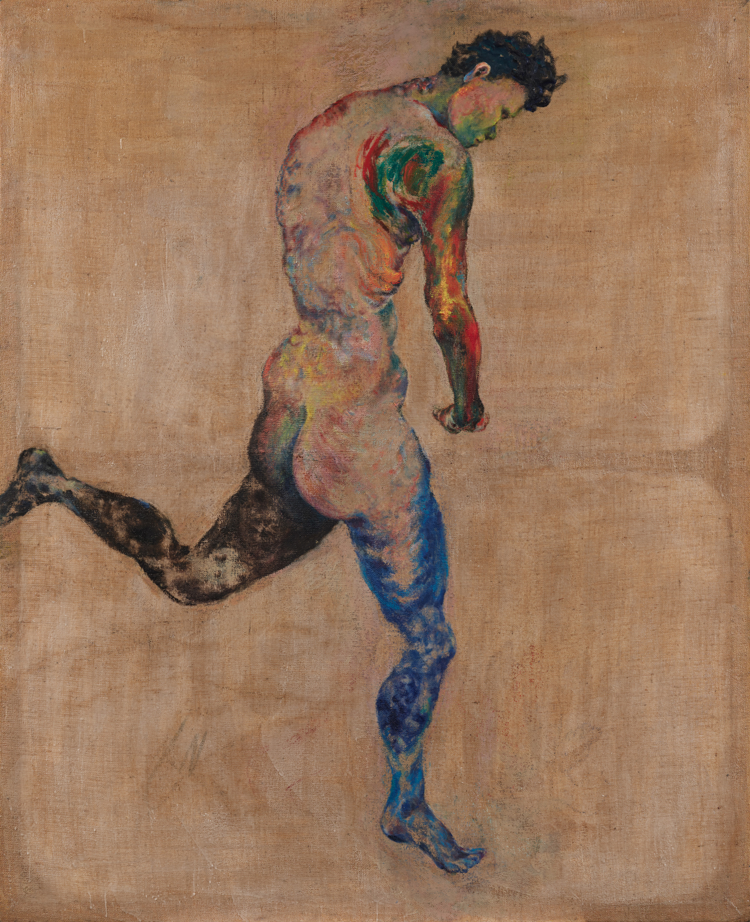 Geringe Leinwandspannung. Leicht durchscheinend (herstellungsbedingt). Vereinzelt minimales Krakelee. Vereinzelt minimale Kratzspuren. Ansonsten guter Zustand.