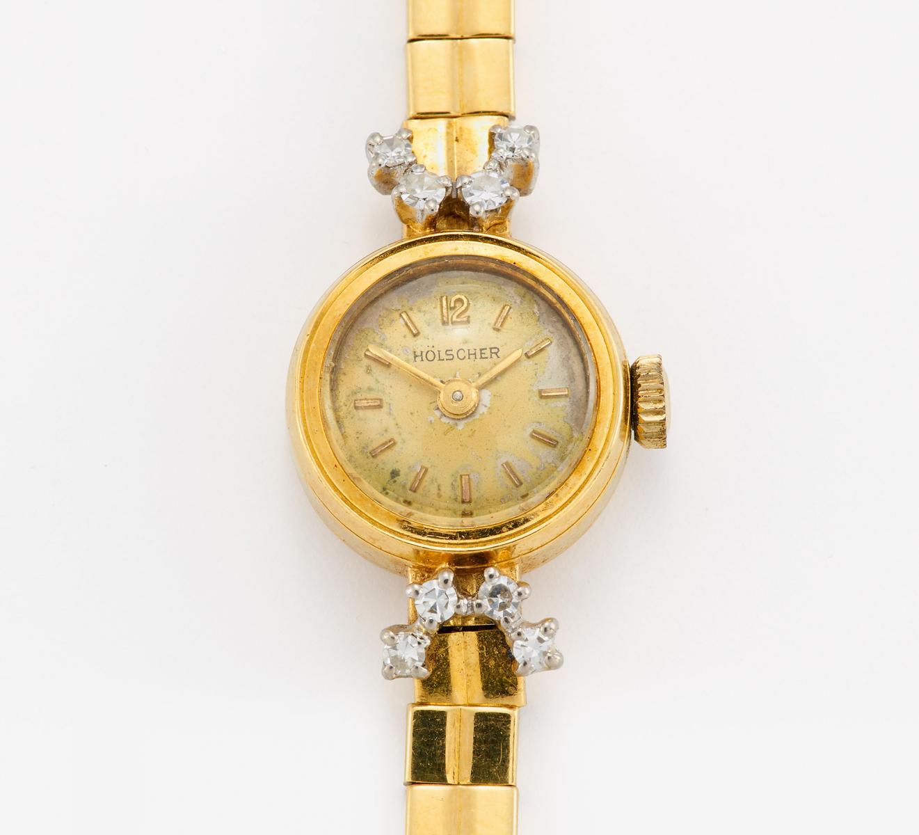 Gehäuse/Armband: 750/- Gelbgold, gest., Zffbl. lackiert und bedruckt, Zeiger/Inidzes golden, Diamantbesatz.