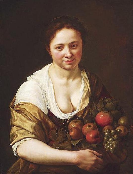 Porträt einer jungen Magd. In der linken Armbeuge eine Artischocke, Äpfel, Weintrauben und Birnen. Halbfigur. Öl auf Holz. 71,5 x 55cm. Rahmen.
