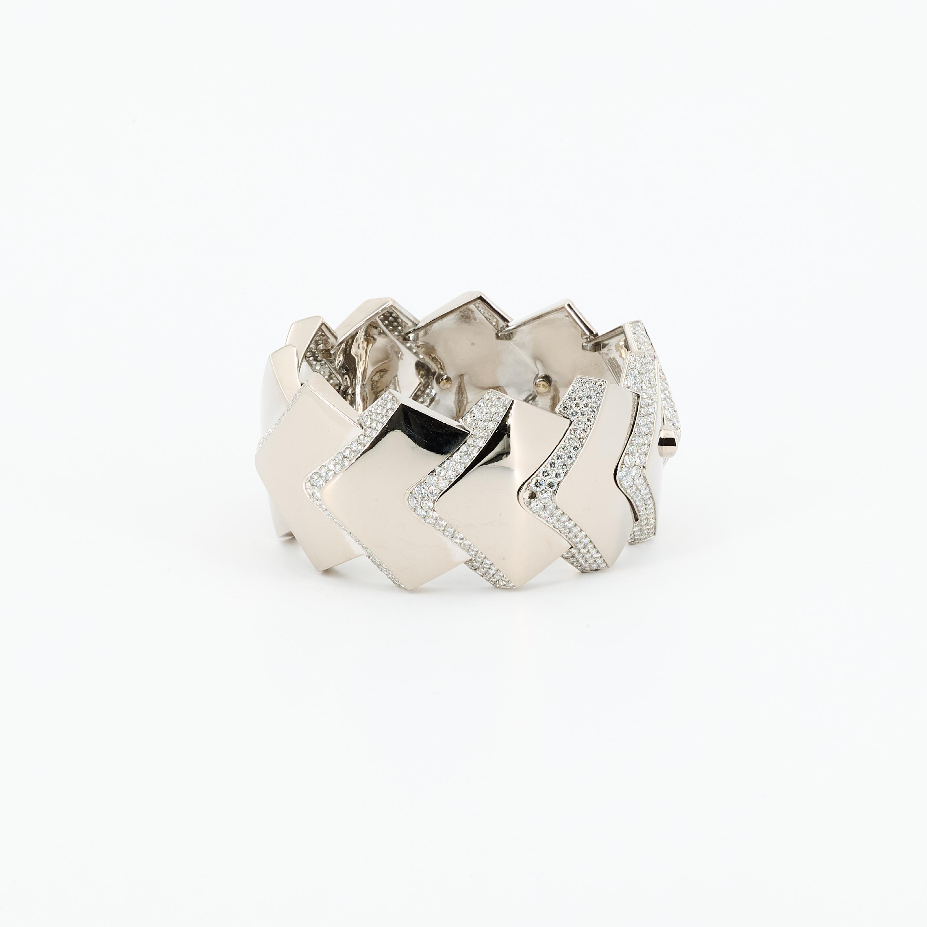 Beschreibung: Signiert "HORNEMANN". Breites brillantbesetztes Armband aus elf ineinander greifenden skulpturalen Gliedern.