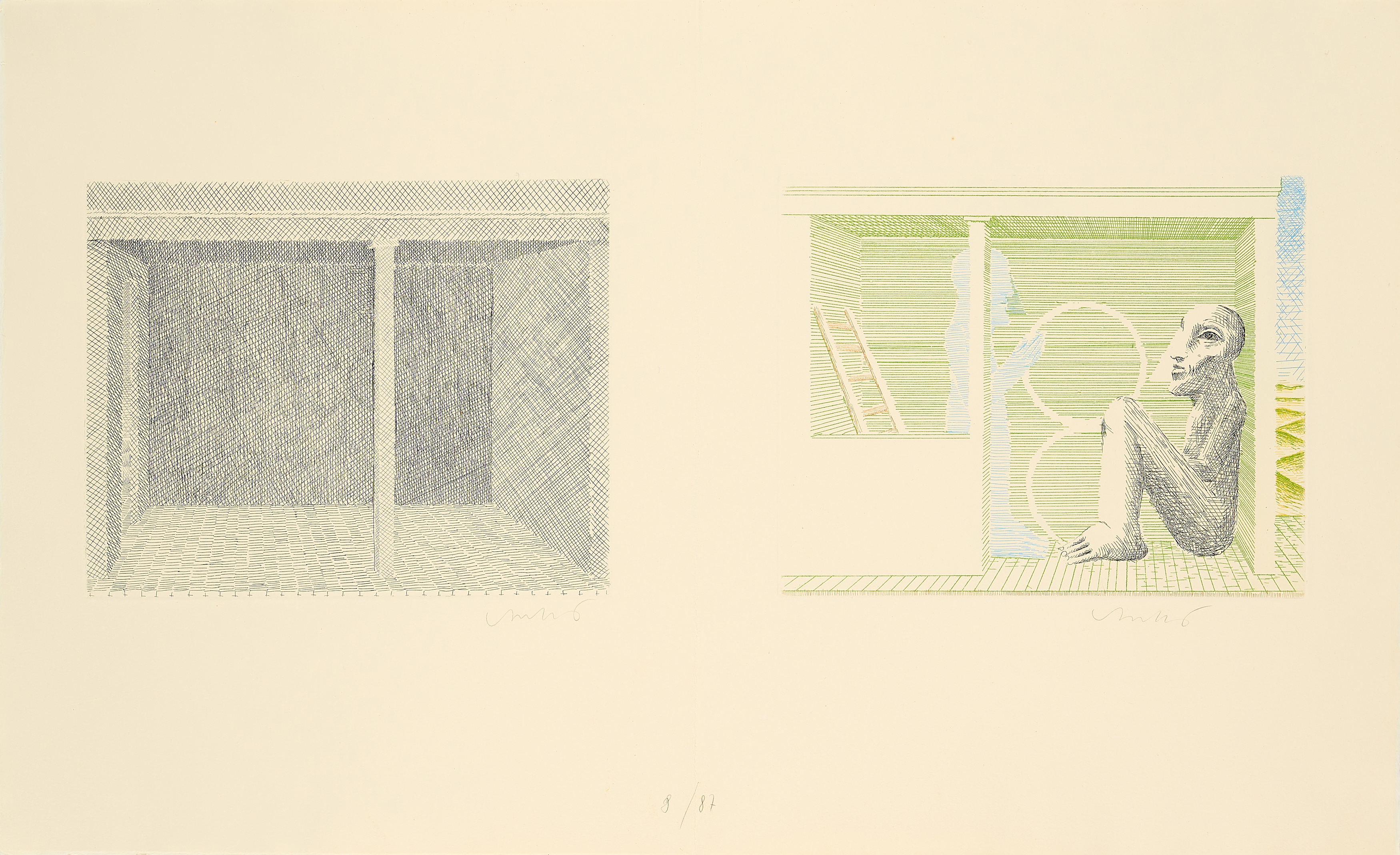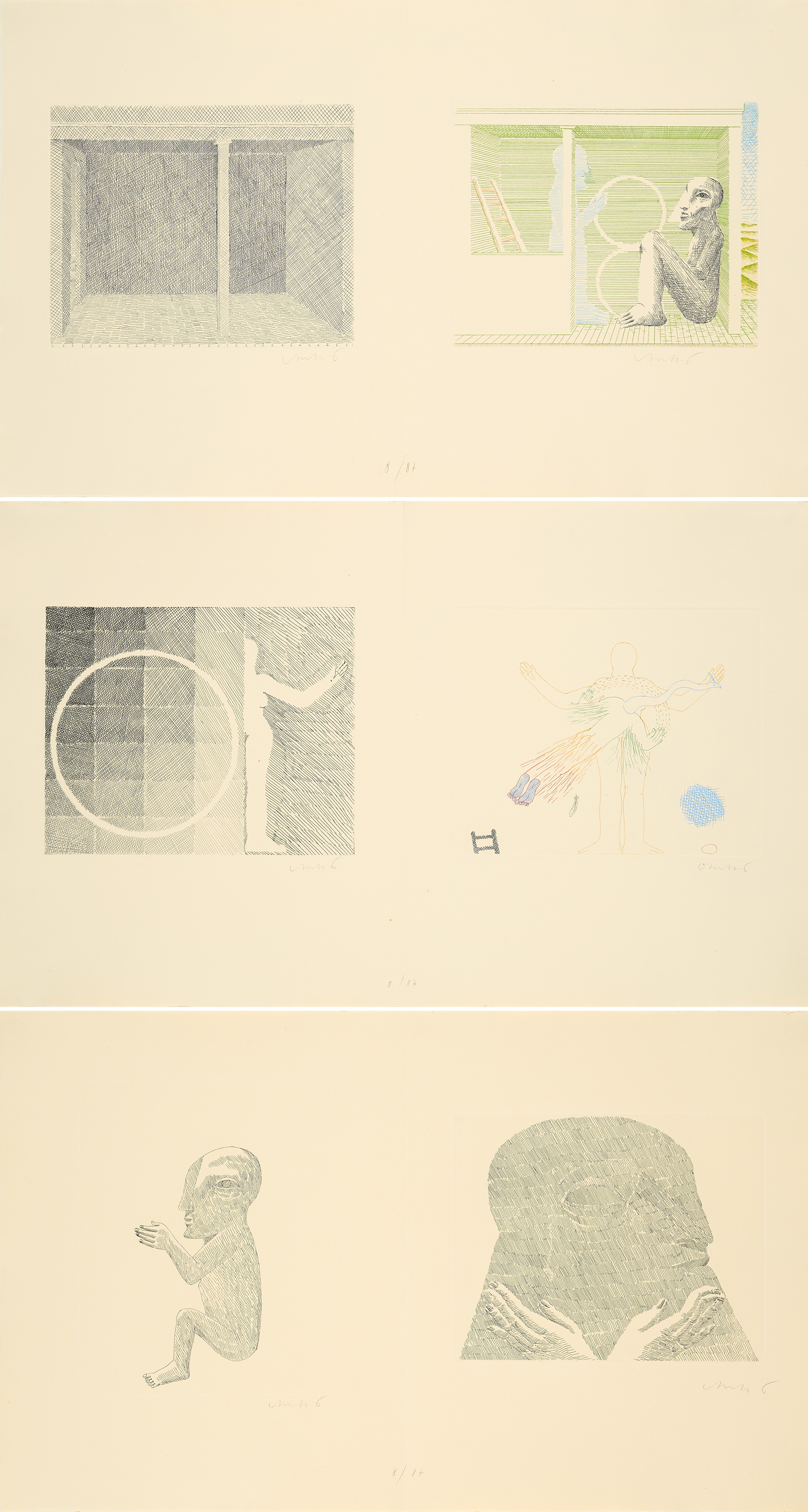 Technik: Jeweils: Radierung, teils farbig, teils mit Prägedruck auf Doppelbogen SICELLINO 1977 (Wasserzeichen).