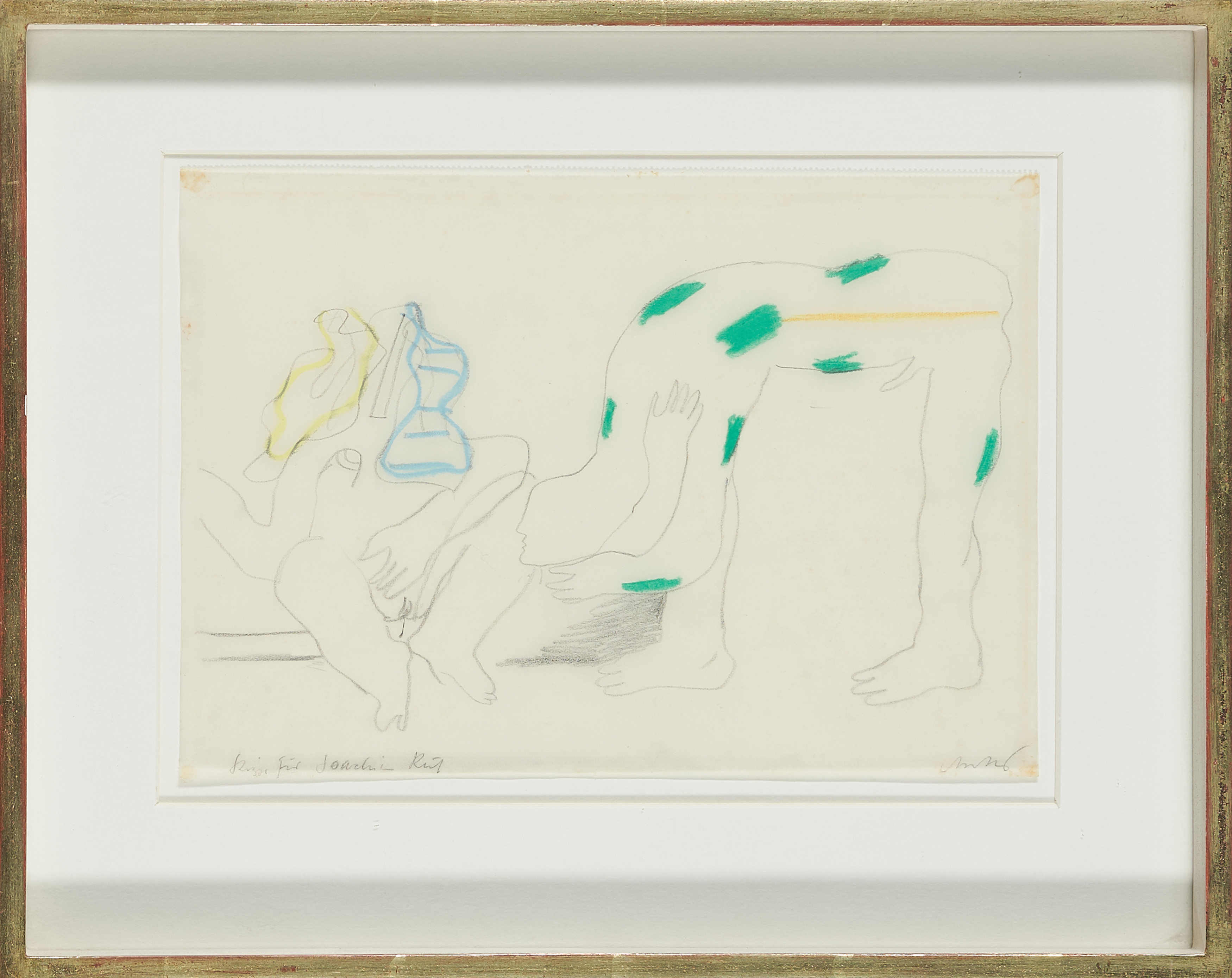 Ohne Titel (Skizze für Joachim Ruf). Bleistift und Farbstift auf Pergamentpapier. 21 x 29cm. Signiert unten rechts: Antes. Sowie bezeichnet und gewidmet unten links: Skizze für Joachim Ruf. Rahmen (33,5 x 42cm).