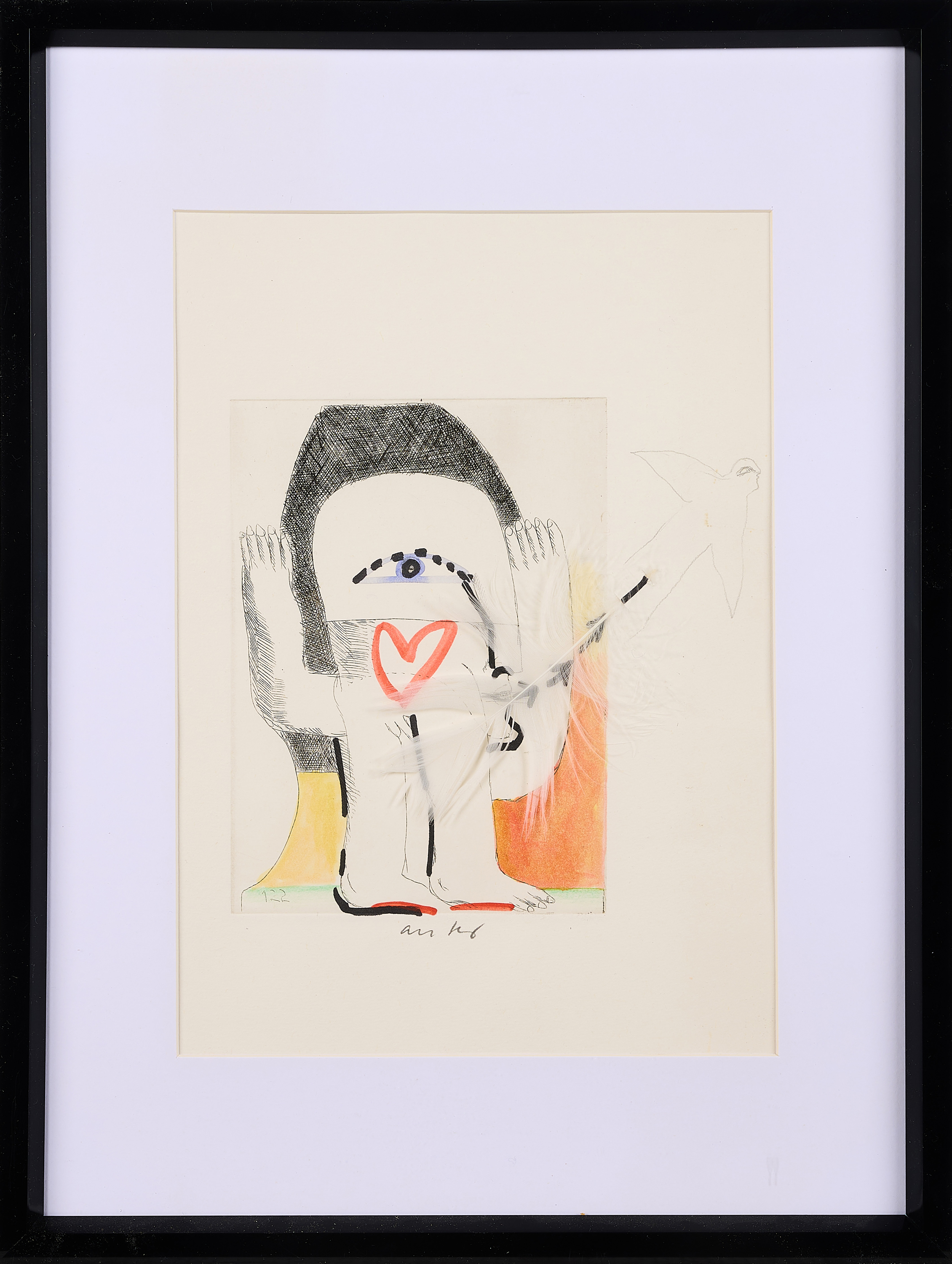 Technik: Zeichnung und Collage über Radierung auf Bütten.