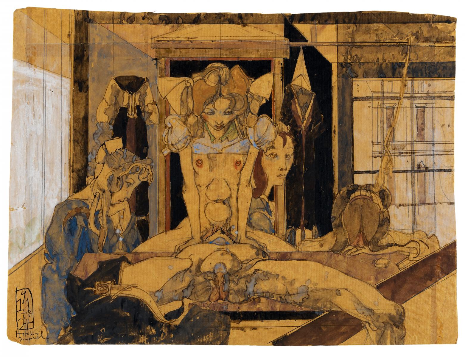 "Hotel Imperial". 1971. Mischtechnik (Bleistift, Tusche, Aquarell und Deckweiß) auf dünnem braunem Papier (collagiert). Fest auf Karton montiert (50 x 65cm). 45 x 60cm. Datiert und monogrammiert unten links: 9117: H J-. Darunter betitelt. Rahmen.