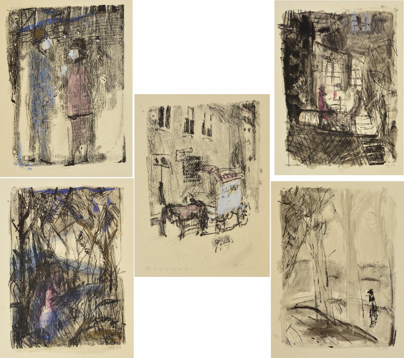 Konvolut von fünf kolorierten Monotypien. 1950. Jeweils: Auf leichtem Karton; zwei Blatt mit Perforierung. 42,5 x 30cm. Monogrammiert und