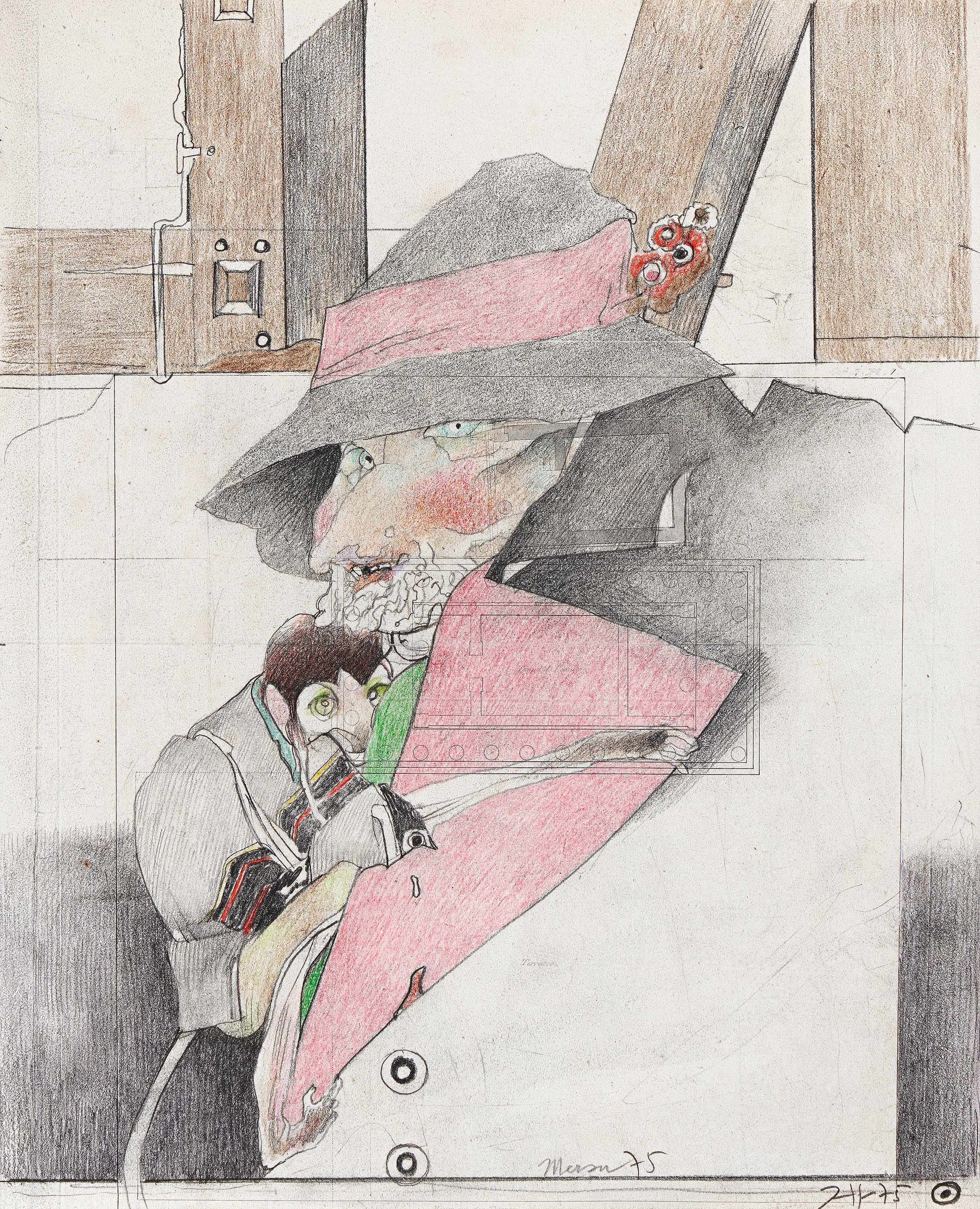 Bezeichnung: Signiert und datiert unten Mitte und unten rechts jeweils: Janssen 75. Bezeichnet am Jackenkragen: Terrasse. Betitelt an der unteren Kante: Mauer vor der Terrasse.