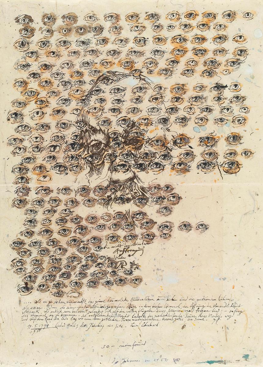 Ohne Titel. 1991. Tusche über Radierung auf Japan. 61 x 45cm. Monogrammiert und datiert im Druck: HJ (ligiert) 30.11.90. Unterhalb der Darstellung Text (Eberhard 19.5.1991). An der unteren Kante gewidmet. Rahmen.