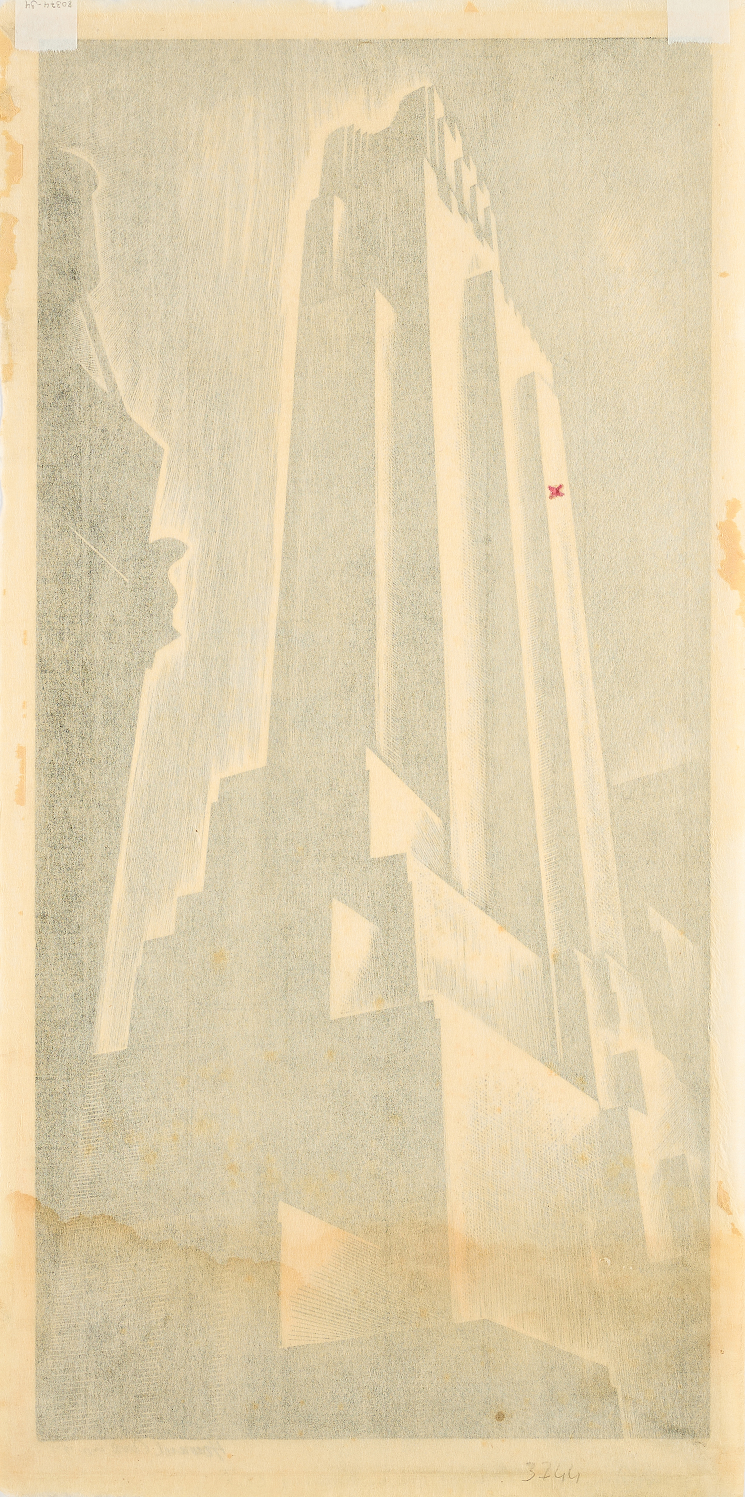 Rotes Kreuz gezeichnet (von fremder Hand) an der Fassade links. Leicht gebräunt. Wasserflecken im unteren Bildbereich, hier minimal gewellt. Verso Reste alter Montierung sowie leicht gebräunt und partiell minimale Stockflecken. Ansonsten guter Zustand.