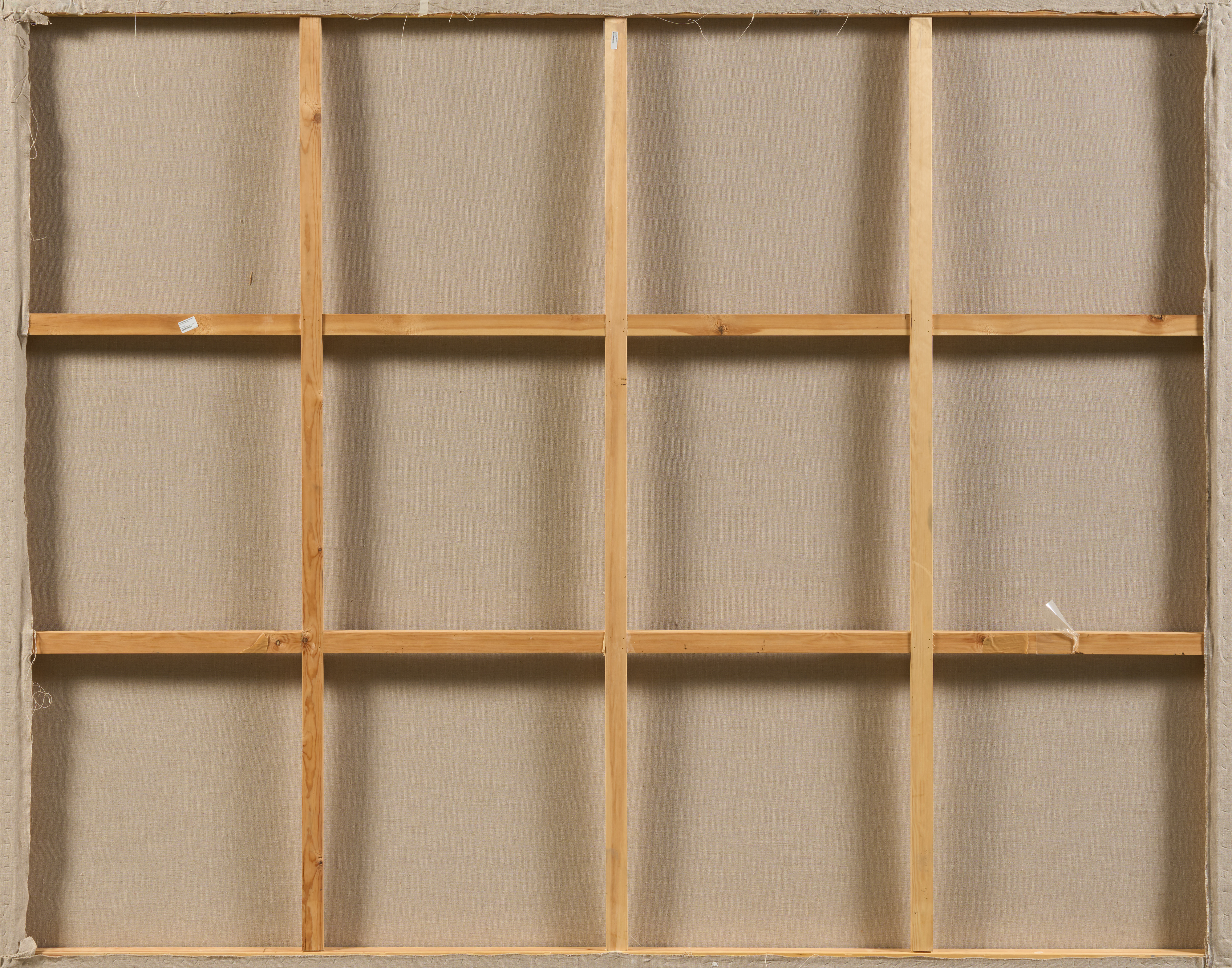 Geringe Leinwandspannung. Minimale Bereibungen an den Kanten. Vereinzelt minimale Abplatzungen an den Kanten. Ansonsten sehr guter Zustand.