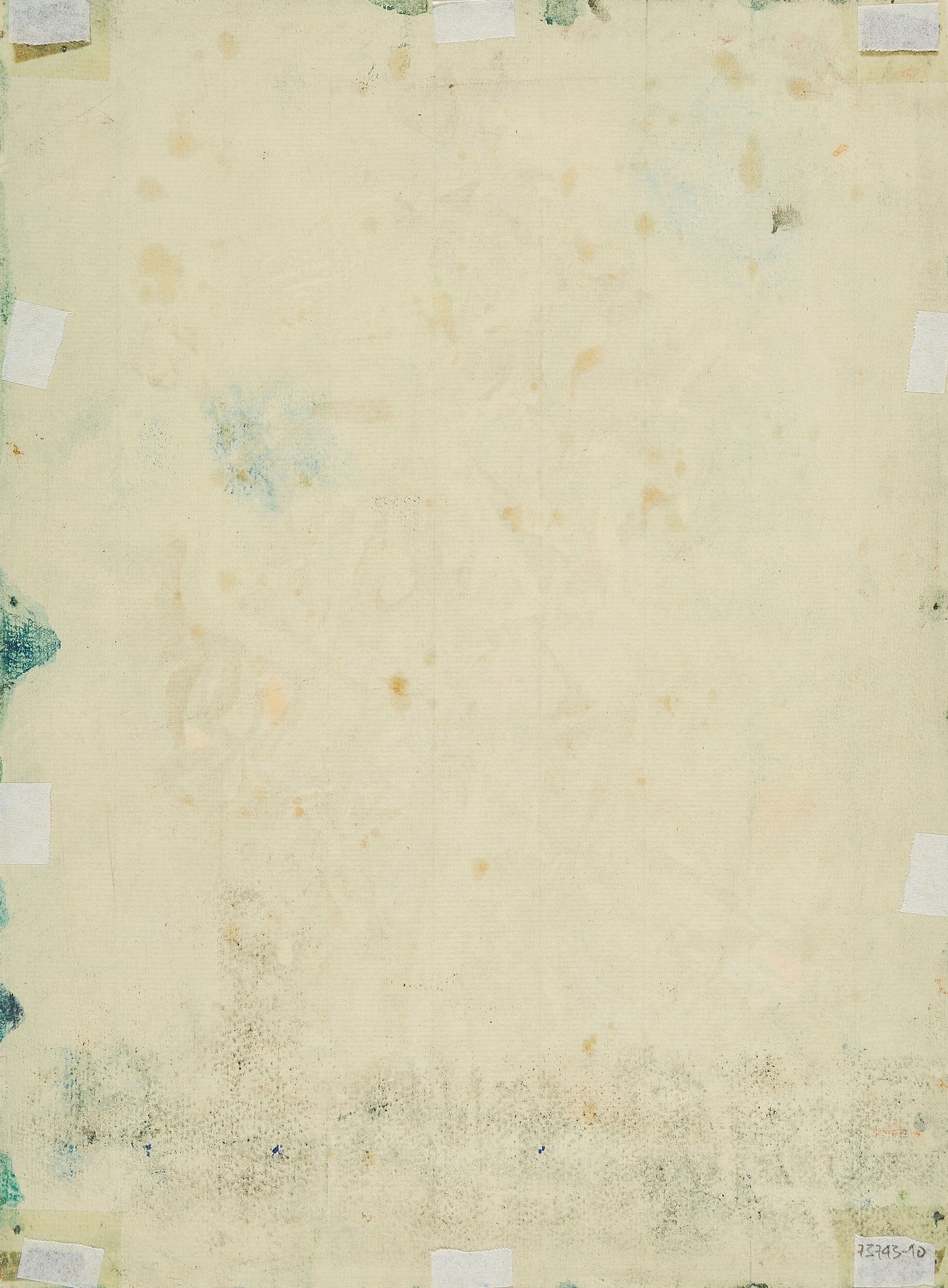 Herstellungsbedingt minimal gewellt. Verso leichte Fettflecken, Arbeitsspuren und Reste alter Montierung. Ansonsten sehr guter Zustand.