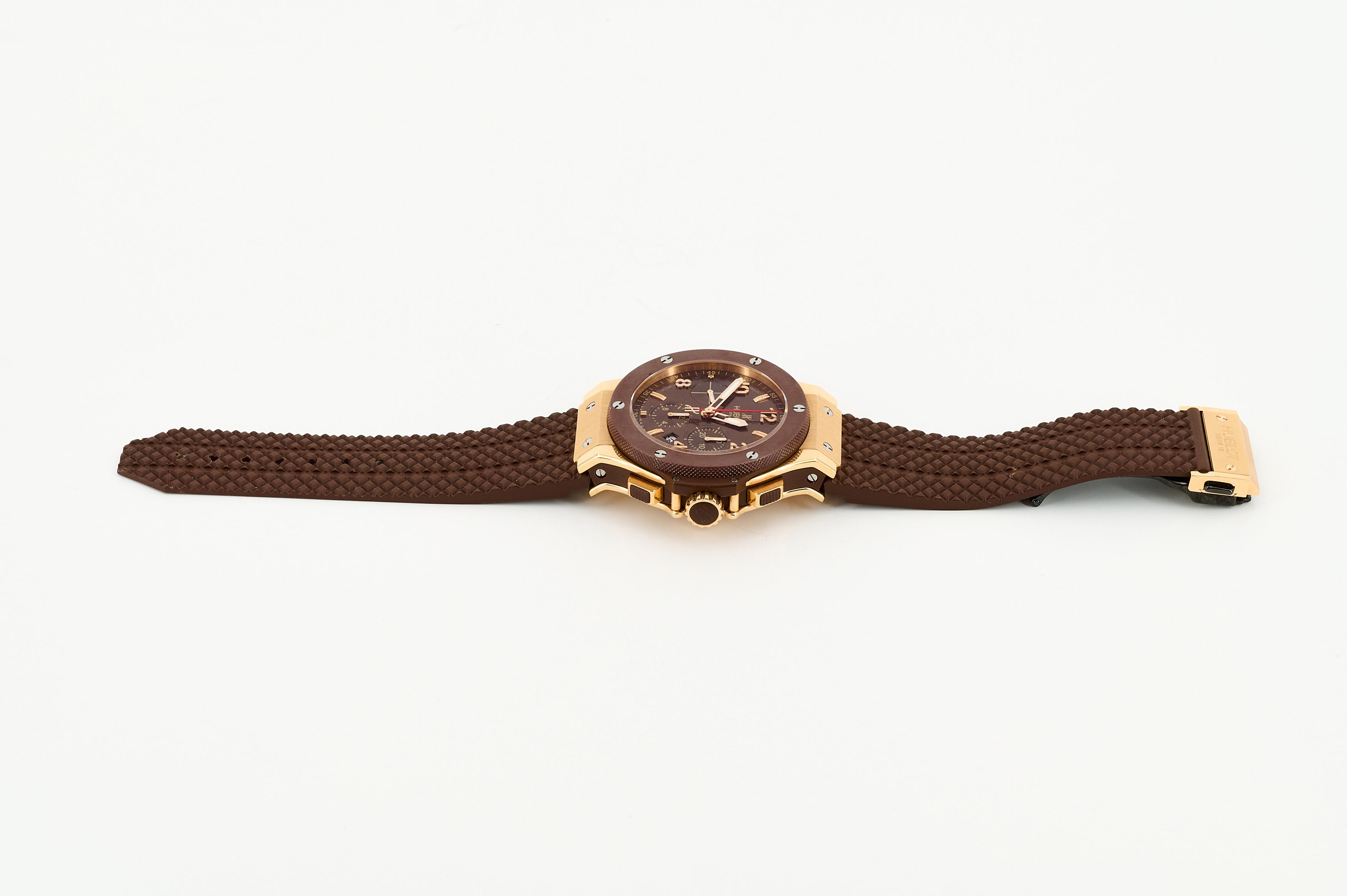 Gehäuse/Armband: 750/- Roségold, Kautschukarmband mit Faltschließe, Zffbl. braun, Zeiger und arabische Indizes golden, Leuchtmasse.