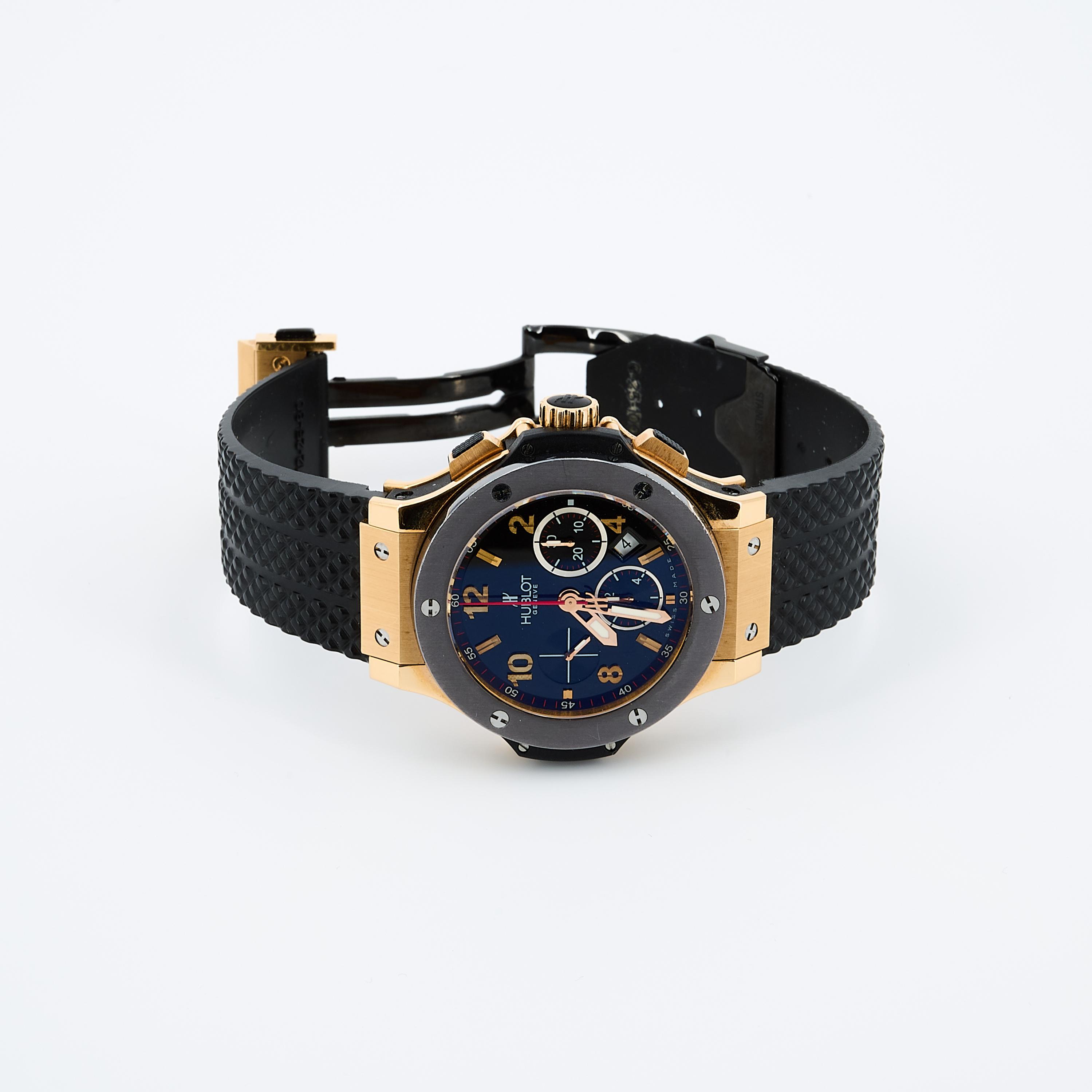 Gehäuse/Armband: 750/- Roségold / Kevlar/ Titan, Kautschukband mit Faltschließe, Zffbl. schwarz, Zeiger und aufgesetzte arabische Ziffern.